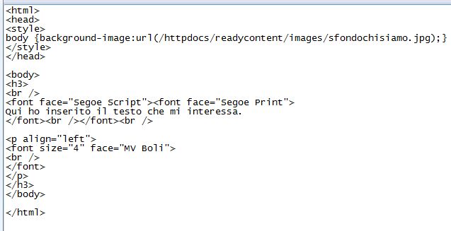 Ciao non ne esco  in Home di area ho inserito un blocco di testo, nel quale voglio inserire una immagine di sfondo (dimensioni 740x850px),l'immagine si trova nella cartella /readycontent/images/sfondochisiamo.ipg. Ho provato ad inserire come elemento in home di area della relativa pagina il codice html che senza indicare tutto il testo scrivo qui sotto, ma nel sito si visualizza solo il testo, ho anche provato con il css ma non sò, sapendo il percorso immagine qual'è la sintassi completa e corretta per inserire il codice css nell'apposita area regole css aggiuntive?