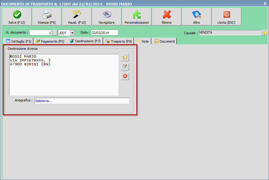 Buongirono, ho notato che quando modifico un'anagrafica cliente per esempio: Anagrafica orginale: PIERO ROSSI - ROSSI, 15 - 00000 ROMA RM Anagrafica modificata: PIERO ROSSI - VIA ROSSI, 15 - 00000 ROMA RM sul documento mi carica come destinazione diversa l'anagrafica originale e quando vado a caricare il file sul sito BRT mi da ROSSI 15 e non VIA ROSSI 15. Come posso fare per far caricare l'anagrafica modificata e togliere l'angrafica originale dalla destinazione diversa? In attesa, porgo cordiali saluti.