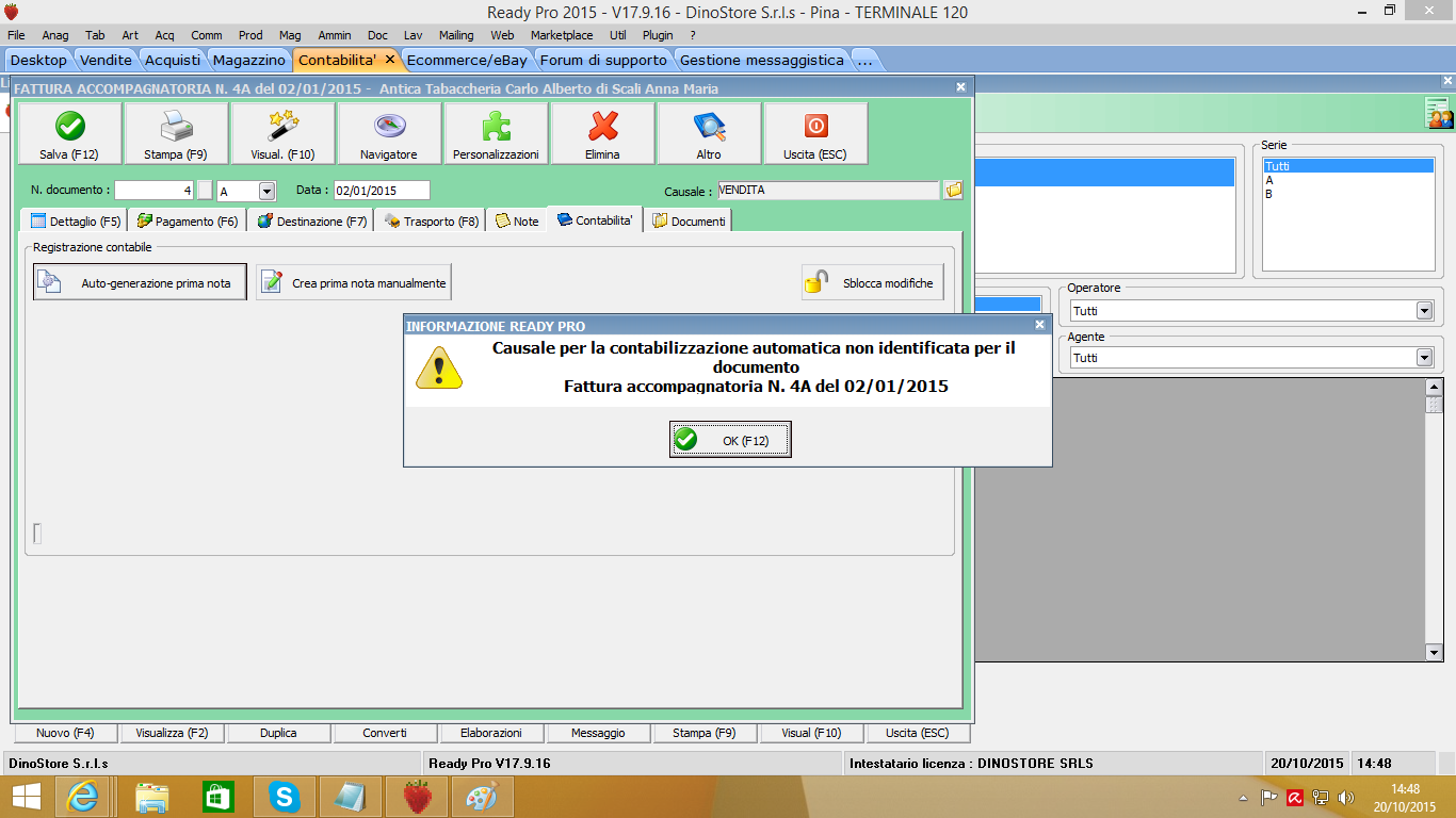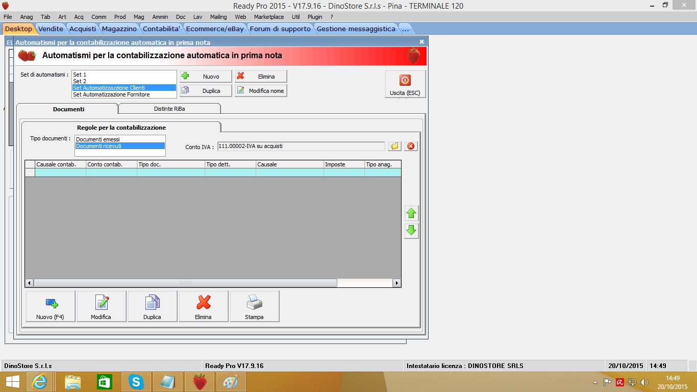 Buongiorno, come ho gia' scritto in precedenza questa domanda e' completamente diversa da quella iniziale, quindi se volete discutere di questo argomento vi prego di aprire un nuovo thread separato da questo. Per quanto riguarda gli automatismi di contabilizzazione potete comunque trovare numerosi esempi qui: http://help.readypro.it/manual.php/it/500/contabilizzazione-dei-documenti-di-acquisto-e-vendita