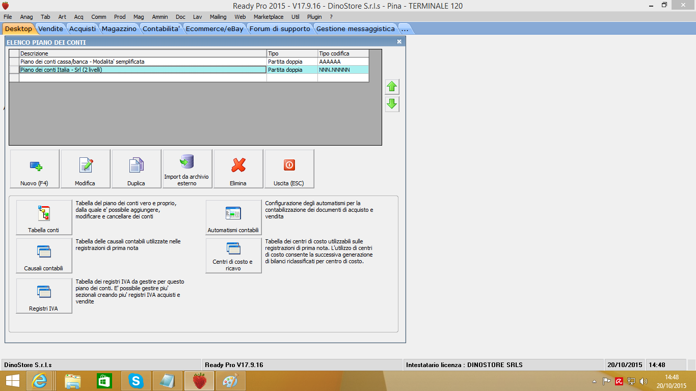 Quello che noi consigliamo di fare, gia' dall'inizio, e' di farsi consegnare dal proprio commercialista un piano dei conti adatto alla propria azienda, ed inserire quello. Ancora meglio se il piano dei conti inserito e' uguale a quello che il commercialista utilizza per gestire la contabilita' della vostra azienda, perche' questo semplifica poi eventuali futuri controlli http://help.readypro.it/manual.php/it/52/come-iniziare-scadenzario-incassi-e-pagamenti-contabilita