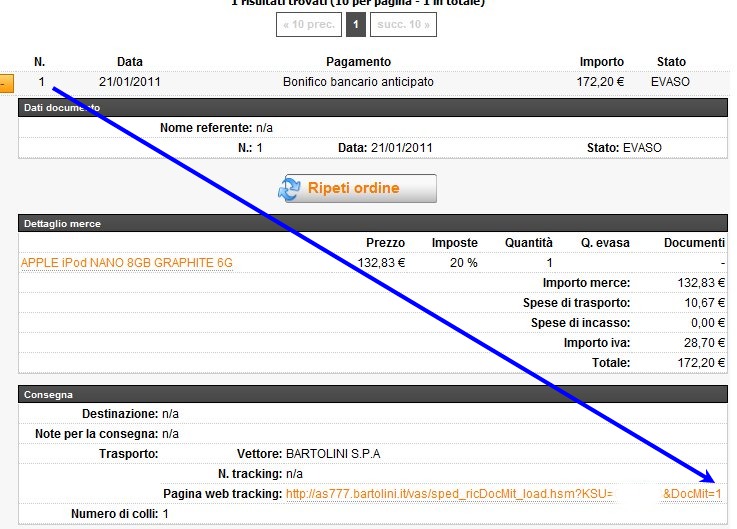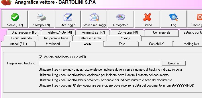 Citazione: Se inserisco questa stringa http://as777.bartolini.it/vas/sped_ricDocMit_load.hsm?KSU=*****&DocMit=<documentNumber> nell'anagrafica vettore torniamo al mio primo post di partenza. E questo va benissimo. Poi devi acquistare ed installare il plugin VISUALIZZAZIONE STORICO DOCUMENTI Per questa soluzione leggi qui: http://www.readypro.it/manuale/storico_documenti.htm e qui: http://www.readypro.it/manuale/gestione_tracking_number_modulo_storico_documenti.htm