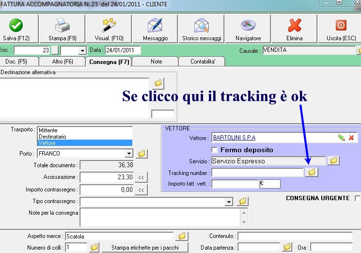 Citazione: Anche questo potrebbe andare, solo che la lunghezza del campo "tracking", è limitata a pochi caratteri e quindi non riesco ad inserirci il link al corriere Se parli del campo tracking all'interno delle fatture e' normale: non e' li' che va inserito  Considerato poi che il tracking viene gestito tramite numero fattura NON devi inserire il tracking da nessuna parte, e' sufficiente la stringa generica http://as777.bartolini.it/vas/sped_ricDocMit_load.hsm?KSU=*****&DocMit=<documentNumber> dentro l'anagrafica del vettore Bartolini (cosa che mi pare di aver capito tu abbia gia' fatto)