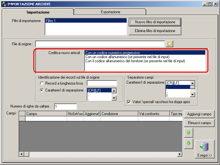 Salve, un mio cliente ha importato degli articoli con lo stesso codice (fornitore sel : Codice art) ora è capitato di dover inserire un altro articolo con lo stesso codice già presente e il programma si rifiuta di inserirlo. Quindi ne deduco che se si importano da file si riesce ad inserirli anche con lo stesso codice ma se si inserisce manualmente viene negato l'inserimento. Si può forzare l'inserimento ? Esempio: F104 è il codice importato e corrisponde all'articolo Guinzaglio pelle nero, Guinzaglio pelle giallo, Guinzaglio pelle rosso etc. oltre alla descrizione differente c'è anche il codice a barre differente. Ora si ha la necessità di inserire sempre il codice F104 con la descrizione Guinzaglio pelle verde ed il suo codice a barre (che è differente da tutti gli altri già inseriti) Attendo consiglio, grazie.