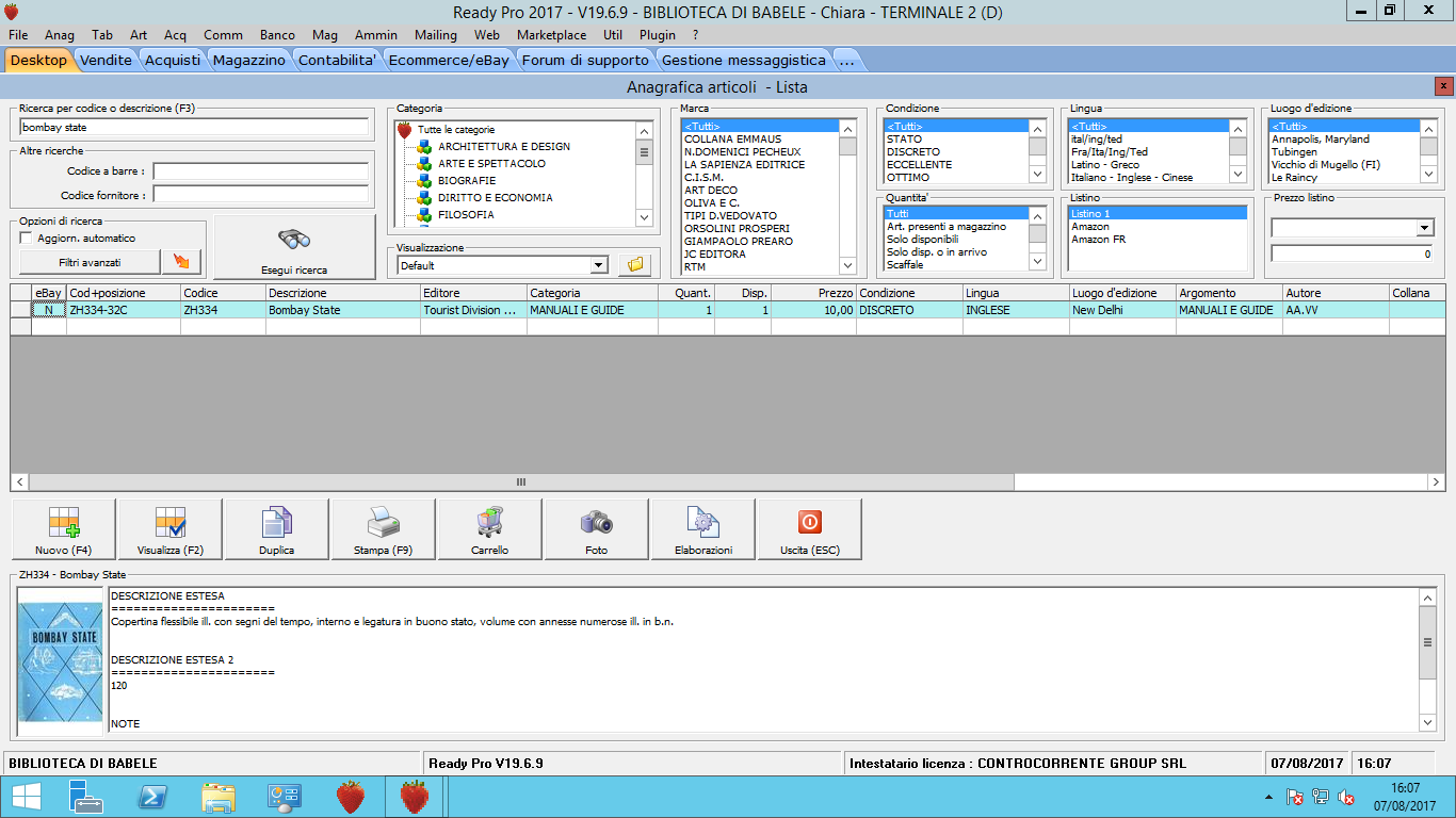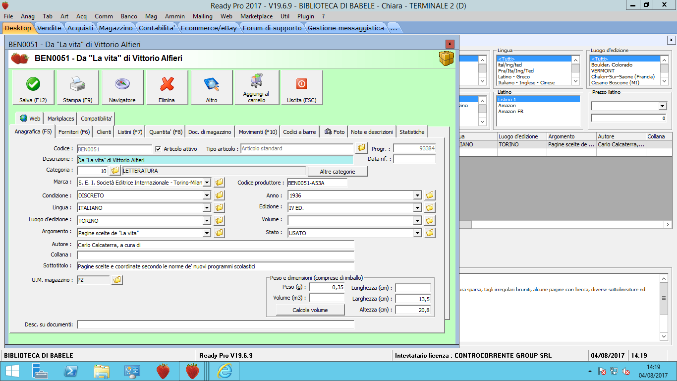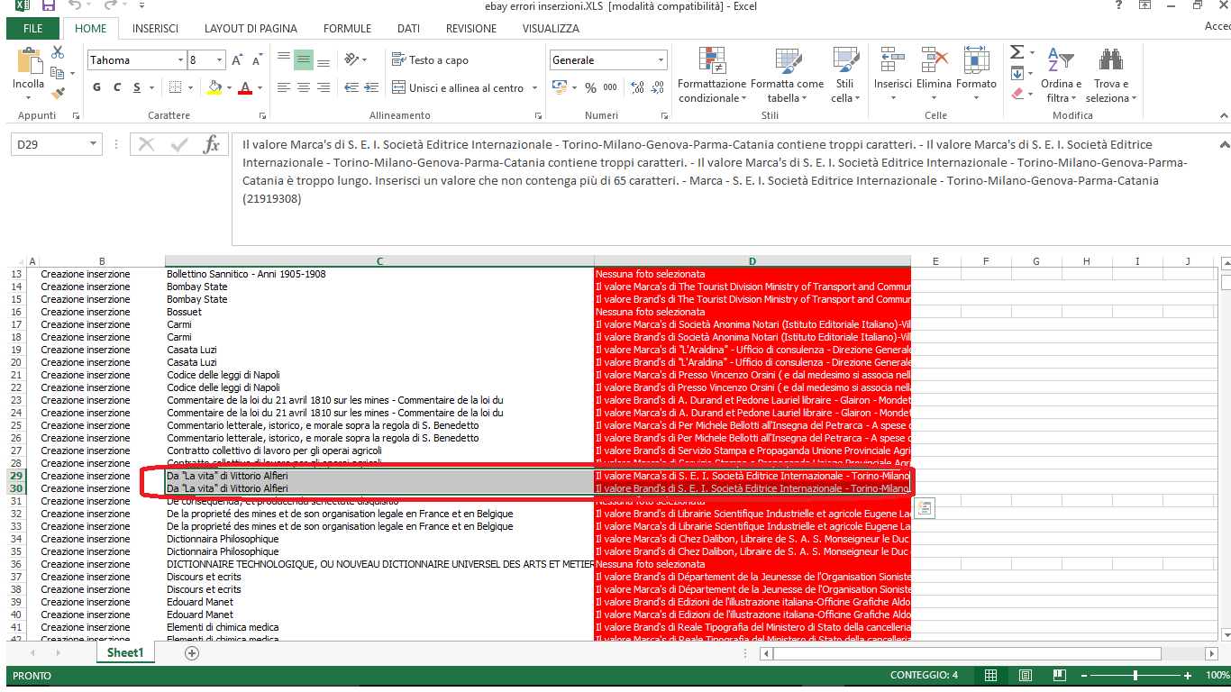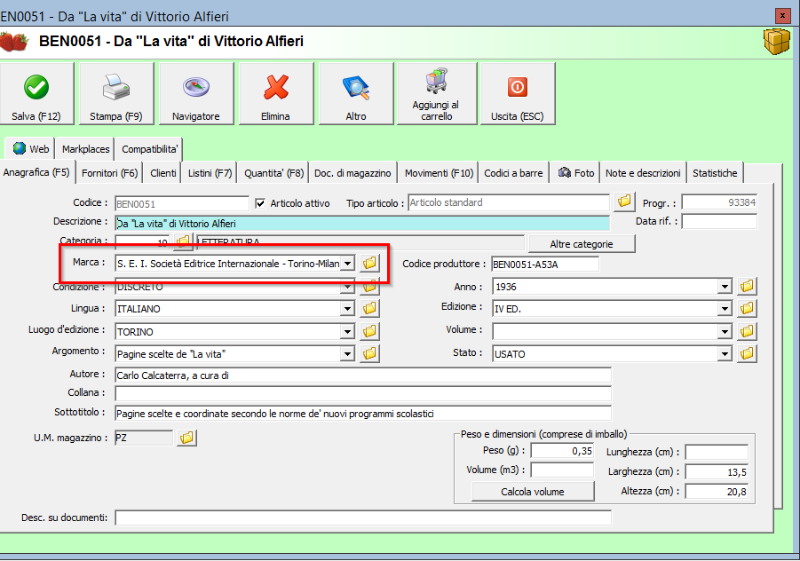 Noi abbiamo un solo articolo con questa descrizione (da "la vita" di vittorio Alfieri). Come vedi nel primo allegato, la schermata rossa di errore legata a questo titolo riporta sia il Valore Marca's che il Valore Brand's ( che apparentemente sembrano la stessa cosa). Per tutte le inserzioni in errore mi da questo doppio valore. Se io entro all'interno del mio articolo da Ready (allegato 2), infatti, la marca è lunghissima. Cambiandola a mano, dovrei risolvere il problema? Non ci sono altri parametri che mi fanno saltare il caricamento?