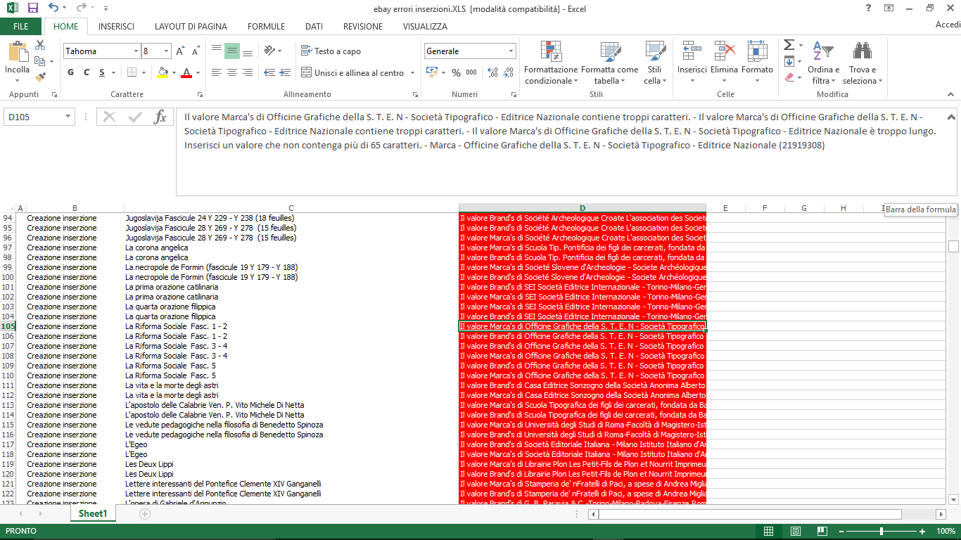 Ho provato ad accorciare la marca per un articolo che mi da errore al momento della pubblicazione inserzioni ebay; dovrebbe stare sui 40 caratteri. Al momento della pubblicazione (la quale ho provato a effettuare singolarmente inserendo soltanto il codice modificato) mi da questa finestra :