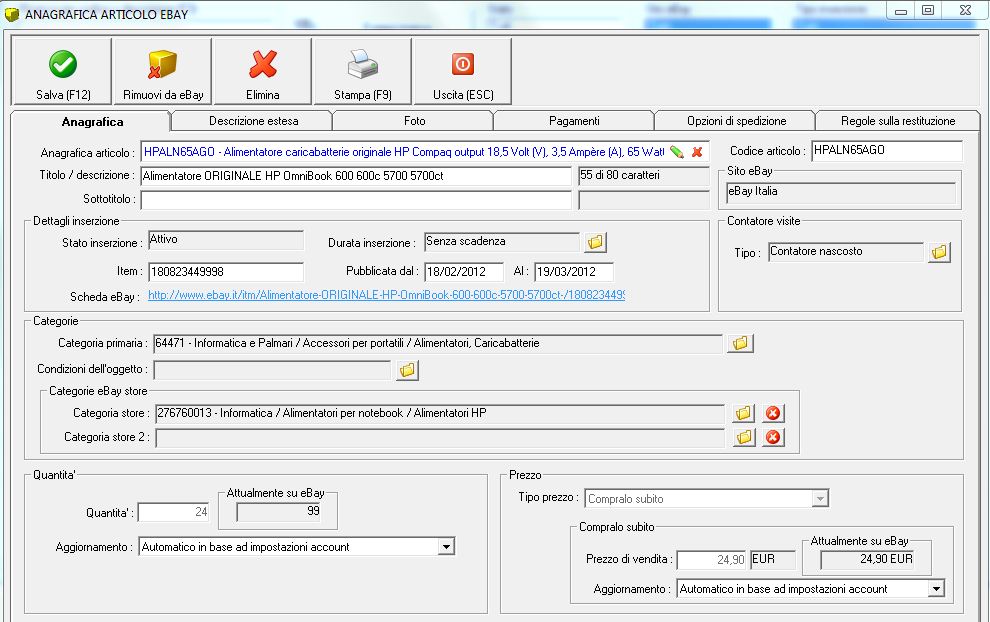 Allegate uno screenshot di una inserzione NON aggiornata, cosi' come appare su Ready Pro. Intendo dell'inserzione di cui parla sopra con 5 pezzi al posto di 12