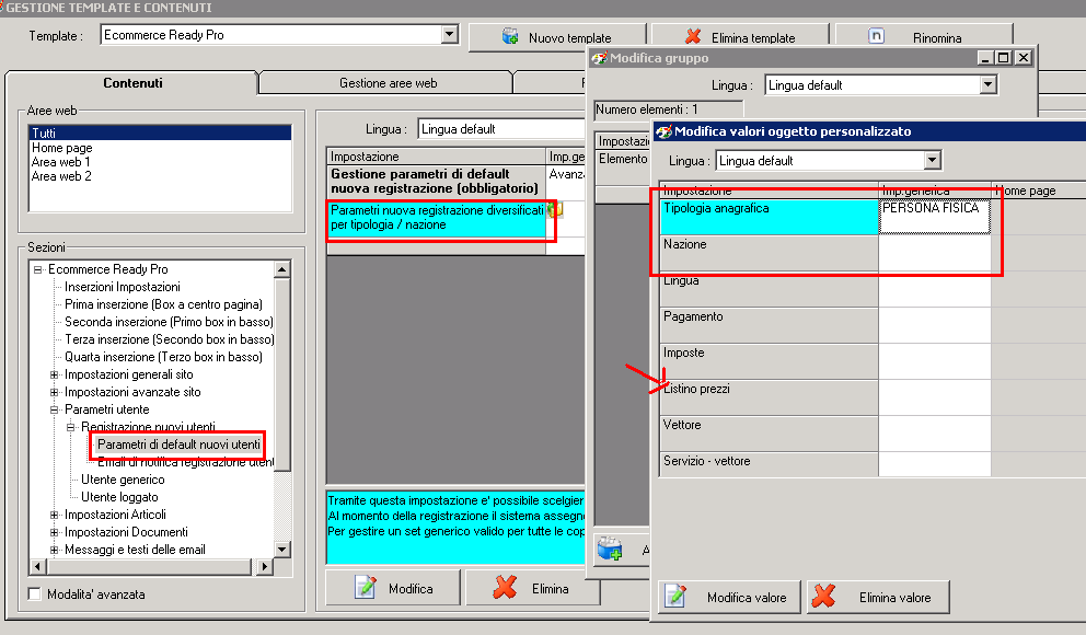 In merito al primo quesito, quindi, dove posso cambiare "tipologia di anagrafica"? ciò in quanto vorrei creare una possibilità di "tipologia di utente" variabile nel caso di "registrazione azienda" (privato/azienda) al pari del sito www.futek.it. Ho provato varie combinazioni dalla sezione "registrazione nuovi utenti" ma non ci son riuscito: anche se imposto la tipologia di utente come campo NON bloccato, esso compare sul form come da compilare necessariamente ma poi non si apre la finestrella a discesa. E quindi sembra funzionare solo se impostato con campo bloccato.