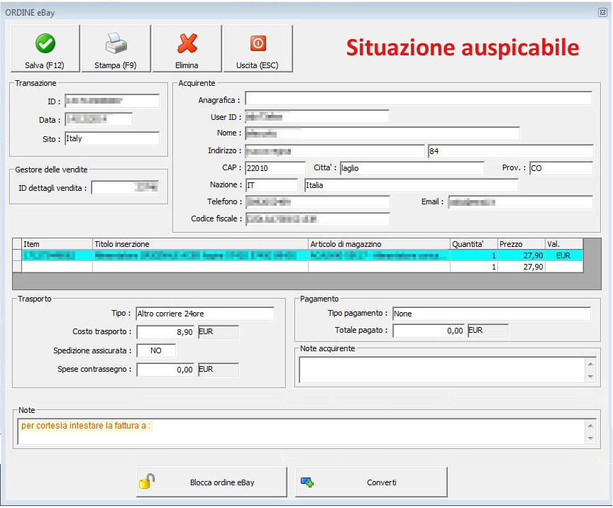 come sappiamo, Ready ci da la possibilità di vedere le note inserite dai clienti in fase di acquisto/pagamento. Infatti aprendo un ordine eBay, nella sezione "note acquirente", troviamo il messaggio che l'acquirente invia inserendolo ad es. su Paypal. Il problema è che molti clienti inviano una mail successiva all'acquisto indicando altre cose come ad es. la richiesta e i dati per poter emettere una fattura, ecc. Ora, dato che la sez. "note acquirente" non è modificabile, e va bene così, perchè non pensare ad una sezione "note" dove noi possiamo riportare tutte le richieste dell'acquirente? Sappiamo che la scheda "ordine ebay" è salvabile anche senza apportare modifiche e quindi ci siamo chiesti perchè non inserire un campo modificabile da noi venditori. Grazie.