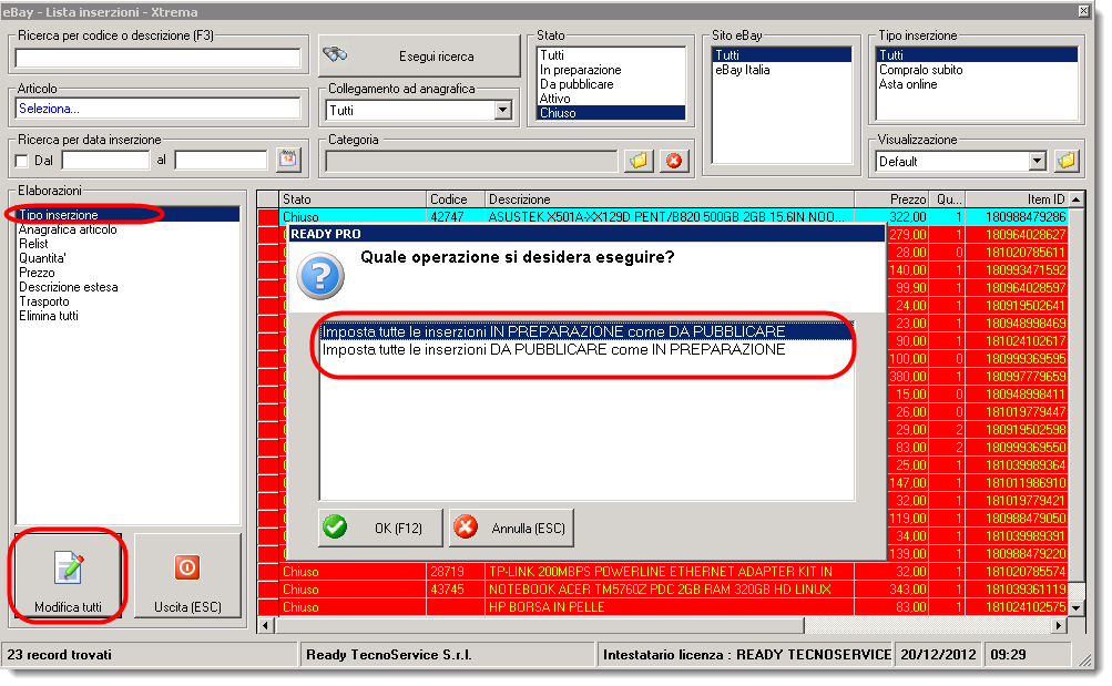Domanda: che versione di Ready stai utilizzando? Con l'ultima versione (14.12.4), o meglio dalla versione 14.11, è possibile fare delle elaborazioni massive sulle inserzioni tramite il pulsante "Elaborazioni". Nel tuo caso, vorresti fare un elaborazione come quella mostrata nello screenshot allegato?