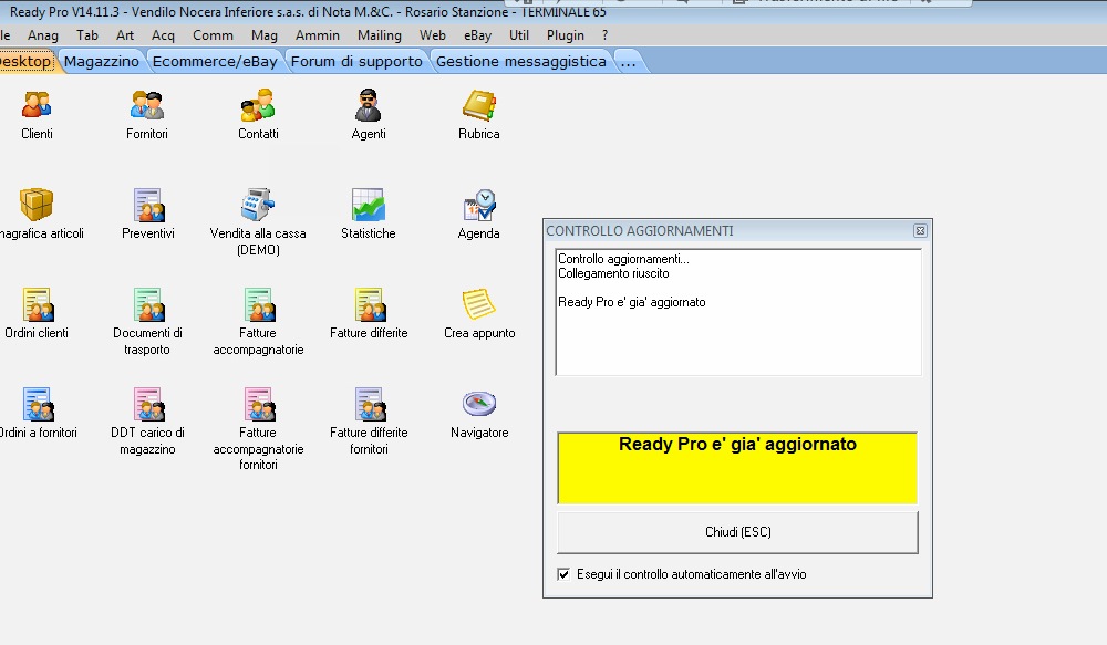 Per scaricare l'ultima versione (attualmente la 14.12.4) devi accedere a questa pagina: http://readypro.it/software-gestionale-download.aspx e scaricare la versione aggiornamento. Quando avvii Ready ora ti appare la finestra che il software è aggiornato perchè della versione 14.11 tu hai installato l'ultima che fu resa disponibile (14.11.3). Dato che cambia il secondo numero (da 11 a 12) dovrai scaricare manualmente l'aggiornamento dal sito, come dovrai fare poi anche per le future versioni, in quanto si tratta di aggiornamenti più sostanzios