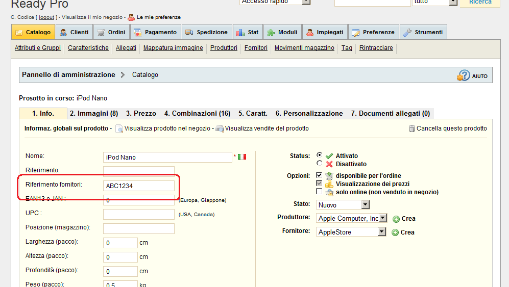 Salve, vi indico il mio problema: il plugin di esportazione dei dati da ReadyPro, esporta anche il codice prodotto, importando appunto su readypro il codice prodotto presente su prestashop. Io vorrei creare per ogni prodotto su prestashop un ulteriore codice (id="cod_radypro"), e vorrei che fosse tale codice ad essere importato come codice prodotto su Readypro e non quello standard di prestashop. Questa cosa è possibile? come? è necessario un vostro intervento sul plugin? Nel caso vi sia possibilità di modifiche adhoc, chiedo se potete contattare me, non il Sig.Giuseppe, al numero 0536-22564, che mi occupo della questione.