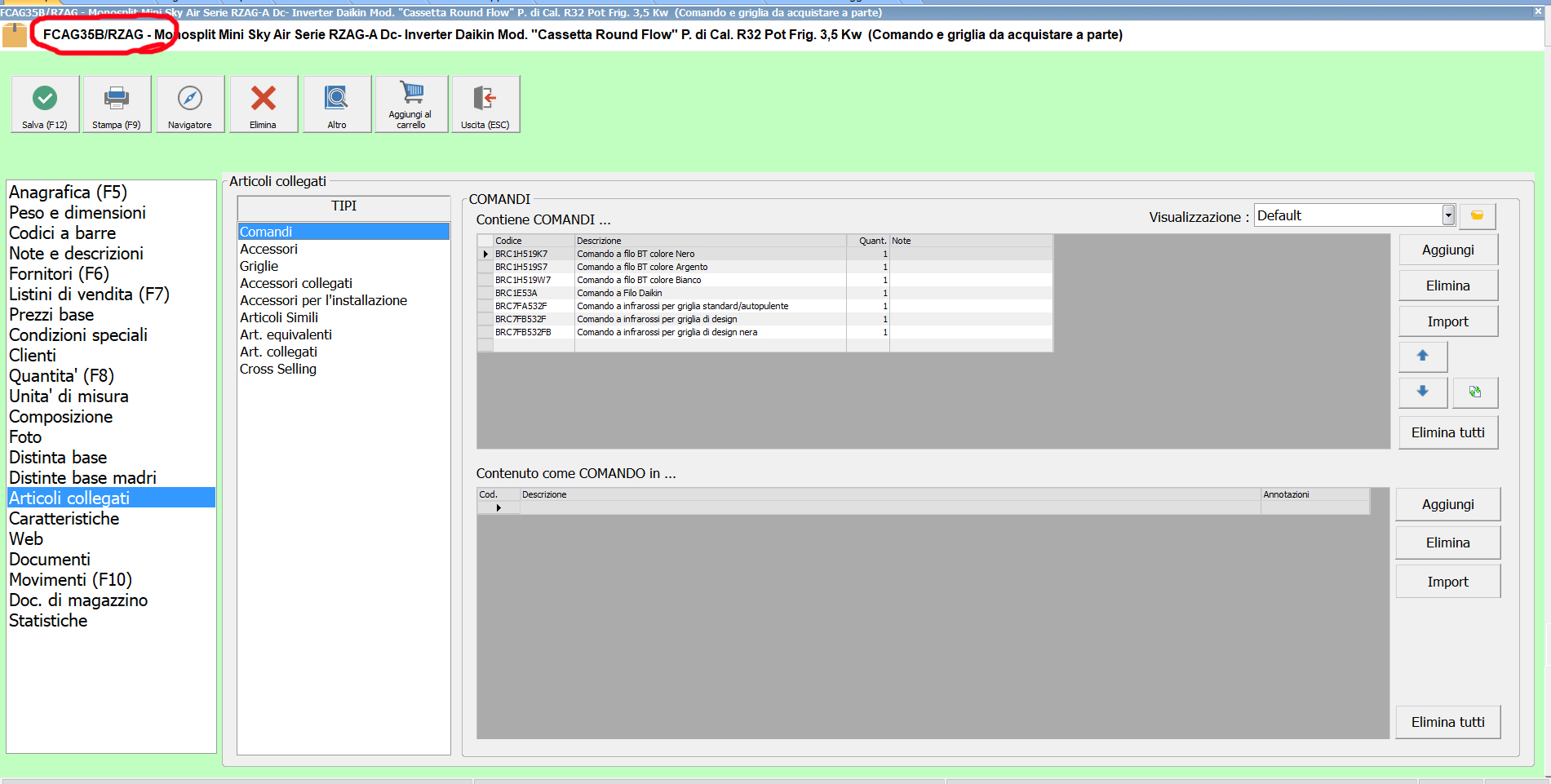 ho creato 3 tipi di collegamento articoli : 1. Comandi 2. Accessori 3. Griglie