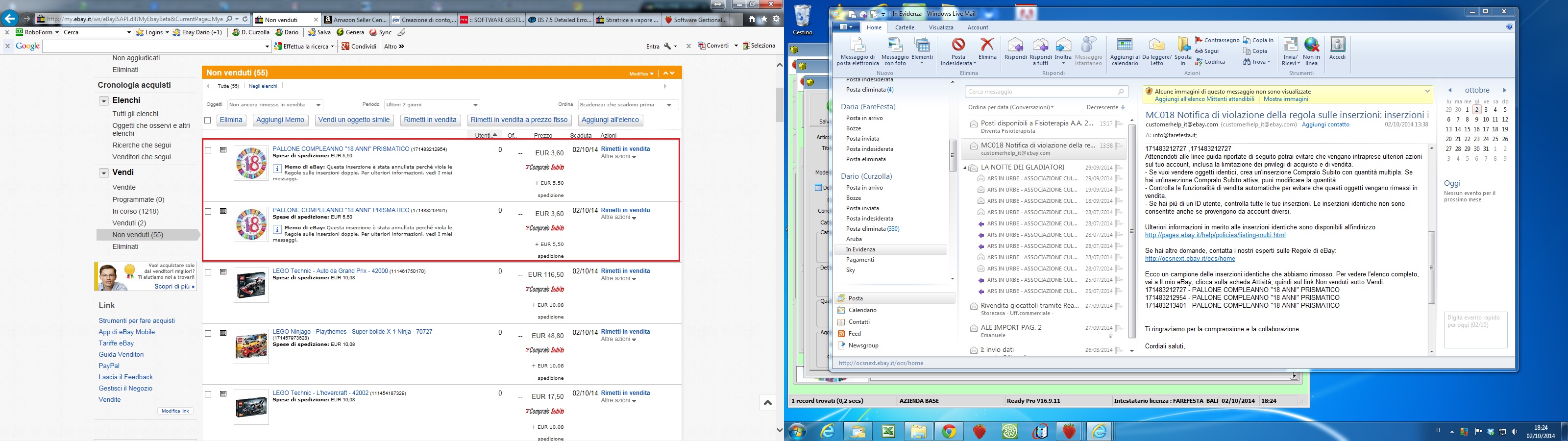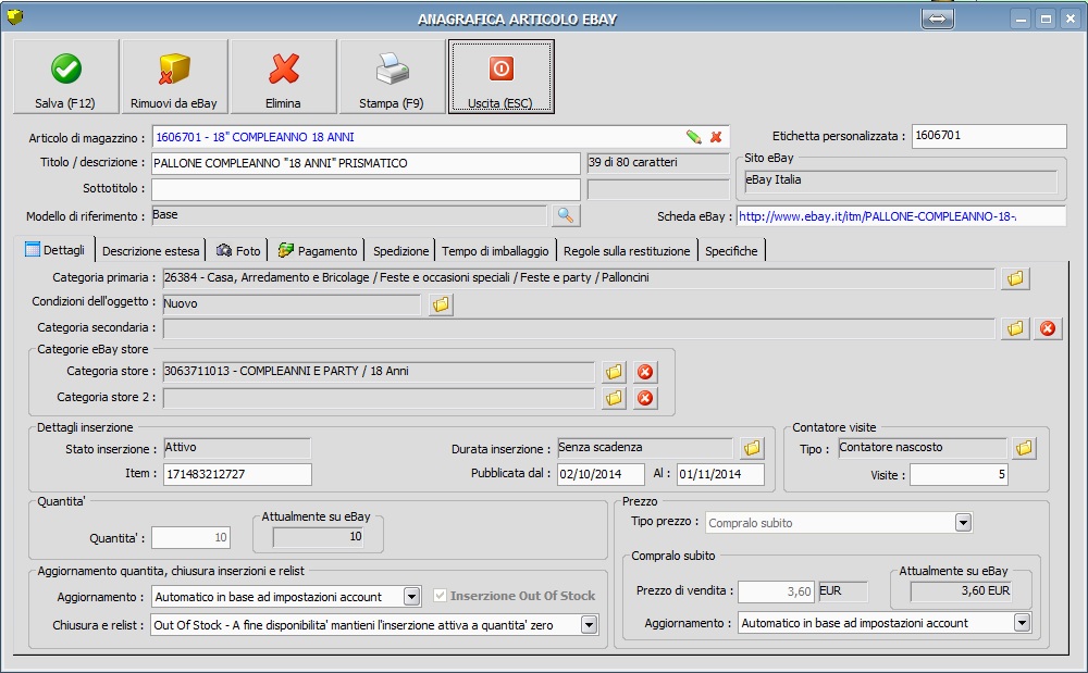 Oggi ho ricevuto una mail da eBay in cui lamenta la violazione della regola delle inserzioni identiche. Ho fatto un controllo e, effettivamente, sullo stesso art. risultavano create tre inserzioni (allegate) con data odierna e orari similari. Su questo art. č attivata la regola Out Of Stock e, fino a ieri, non era presente in magazzino. Ieri sera ne sono stati caricati 10pz, e questa mattina, con la procedura Batch che viene lanciata tutti i giorni, č stata fatta la sincro con eBay. Su questo art. non ho fatto nessun intervento manuale (almeno non oggi) Che puņ essere successo?