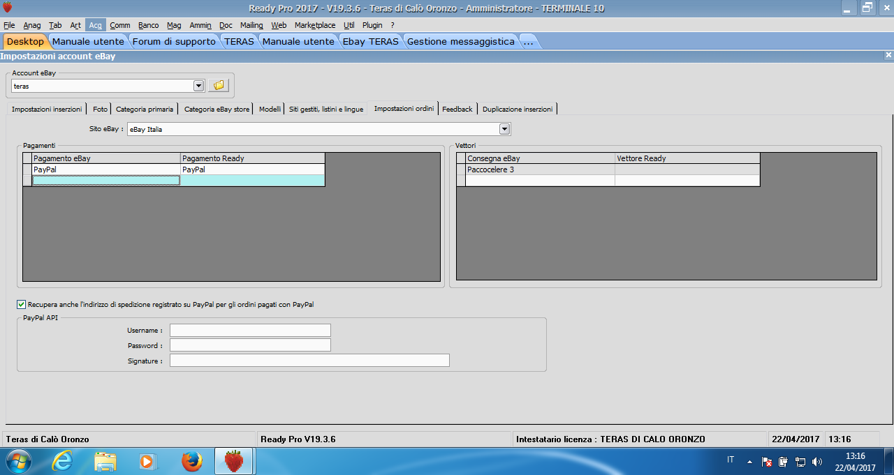Mi sono accorto che pur impostando diversi metodi di pagamento in ready pro nelle impostazioni del marketplace ( nella sezione pagamenti dei modelli di inserzione avevo impostato oltre paypal anche bonifico e altro ) su ebay invece compare solo paypal come metodo di pagamento . Dopo un po' di ricerche nel mio account ebay mi sono accorto che tra i metodi di pagamento era impostato solo paypal come metodo . Cosi ho tolto la spunta come metodo preferito e in effetti è comparso , nel mio account ebay , anche "infobonifico" . Adesso non ho ancora fatto alcuna prova se sulle inserzioni compariranno anche le informazioni inserite . Ma mi chiedo : -e per gli altri metodi di pagamento ? ad esempio carta di credito , altro.. -come mai pur avendo impostato nei modelli di inserzione in ready pro altri metodi di pagamento non compaiono? -come mai se provo ad aggiungere altri pagamenti nelle impostazioni ordini non me lo consente ? ( vedi foto che segue )