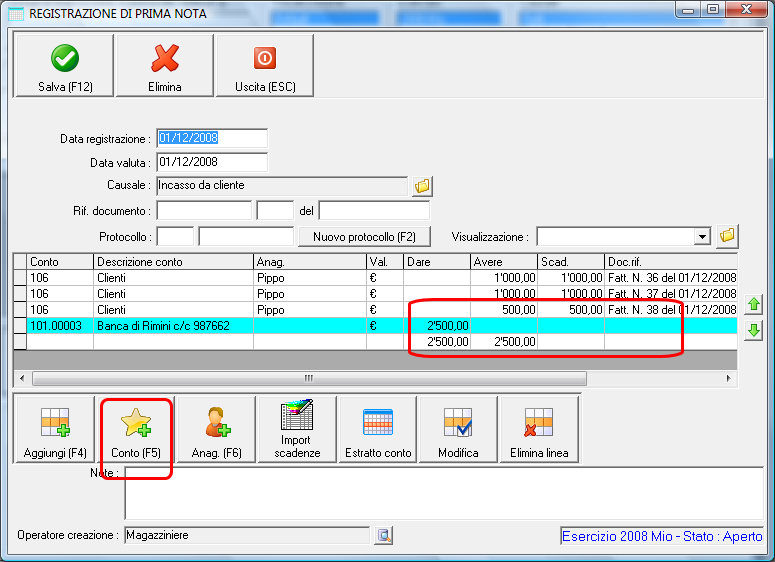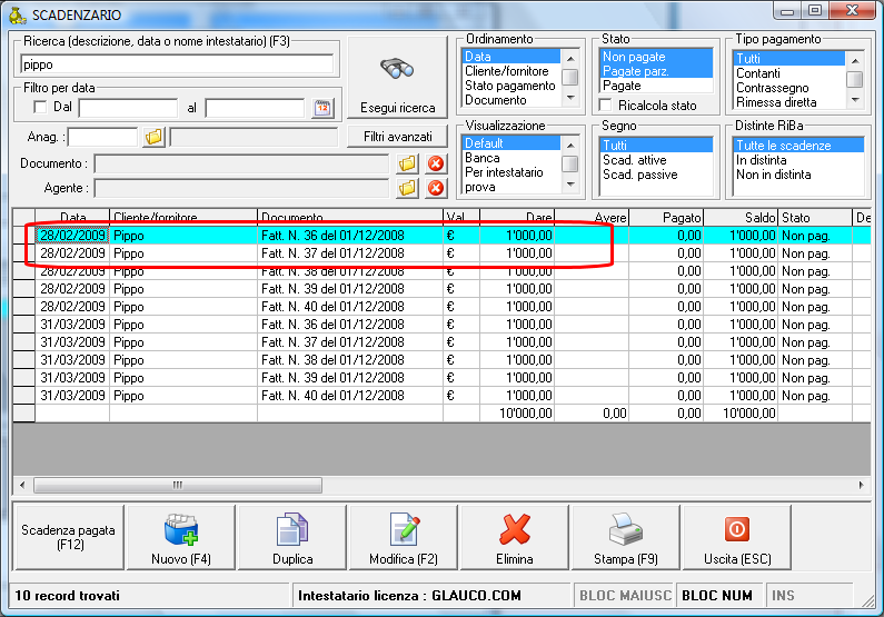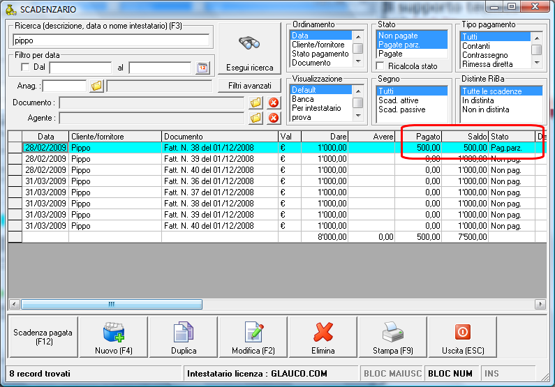 Ciao, premetto che parliamo di un cliente con fatturazione separata per ogni D.d.T. Ho emesso diverse fatture a cliente "Pippo" con pagamento 60/90 gg a mezzo B.Bancario. Quindi ipotiziamo 5 fatture da € 2000,00 cad. divise in due scadenze al 30/09/08 e 31/10/08. Avrò quindi al 30/09/08 scadenze pari a € 5000,00 e al 31/10/08 altri € 5000,00 Al 30/09/08 il cliente anziché pagare i € 5000,00, effettua bonifico pari al 50% dell'importo pari a € 2500,00. Ho provato a registrare i pagamenti nello scadenziario, ma il programma non accetta il pagamento parziale dell'importo in scadenza. Come registro i pagamenti ricevuti? Grazie.
