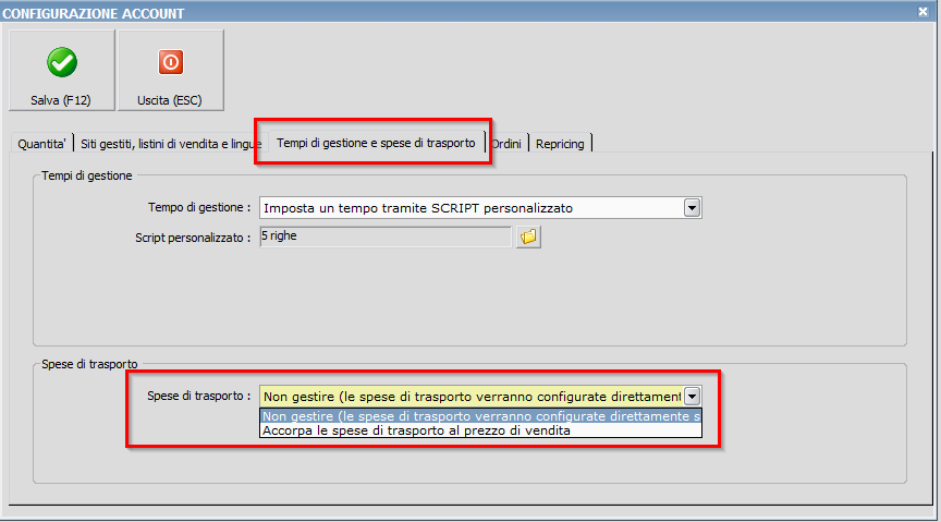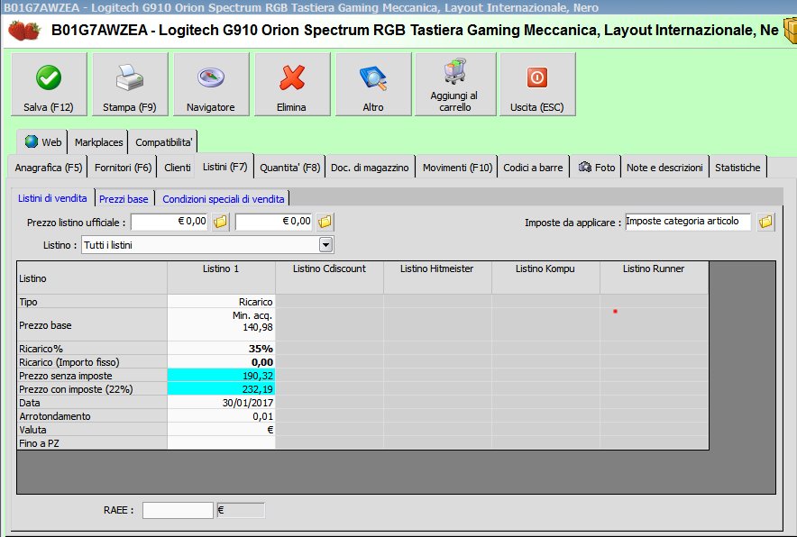 Citazione: sul lato sinistro dello screenshot si vede prezzo diverso su ready listino1 euro 301,34. forse mi somma le spese di spedizione......ma mi sembra alta la differenza... Se Ready Pro e' configurato per sommare le spese di spedizione si puo' verificare facilmente dalle impostazioni. A seconda di come avete configurato le spese possono essere facilmente 40,00 euro o anche 400,00, questo solo dagli screenshot sopra e' purtroppo impossibile capirlo