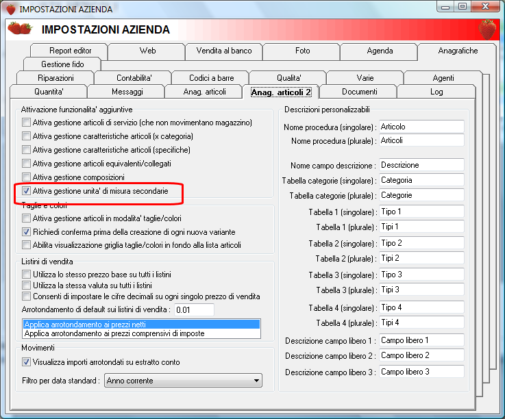 Citazione: ma non capisco perchè nell'impostare come prezzo base il prezzo MASSIMO DI ACQUISTO (che tra l'altro mi indica) non mi varia il prezzo base, di conseguenza il prezzo di vendita (con ricarico) Ho notato che non hai abilitato il tab UNITA' DI MISURA. Per farlo e verificare quanto spiegato da Fabio devi andare su UTIL / IMPOSTAZIONI AZIENDA / ANAG. ARTICOLI 2. ed abilitare questa opzione: