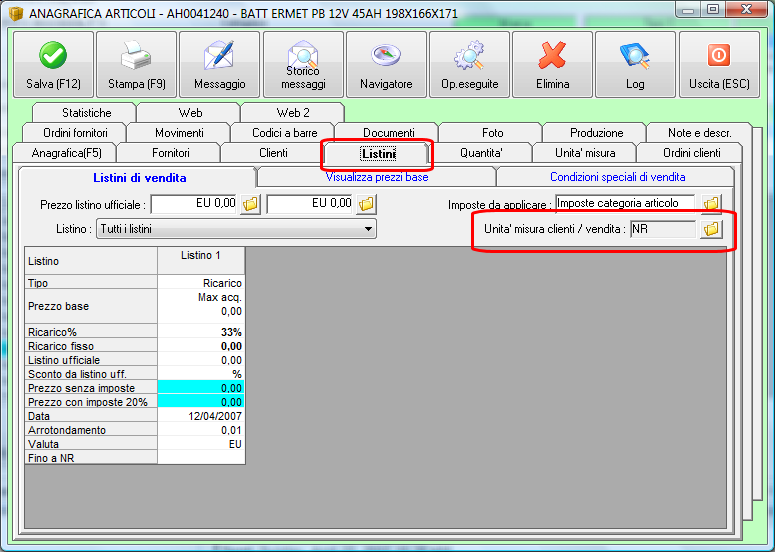 A questo punto vai sull'etichetta LISTINI e modifichi l'UNITA' DI MISURA CLIENTI VENDITA come mostrato in figura. Se sono molti articoli ti conviene esportarli su un foglio di excel e reimportarli aggiornando l'unità di misura in PZ.