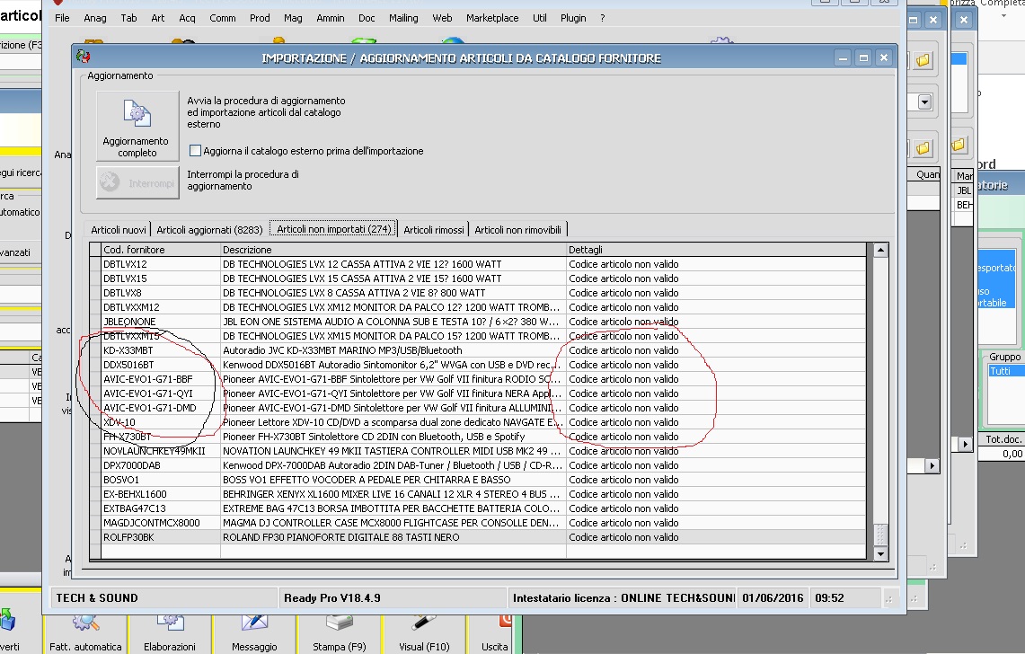 2) Alcuni prodotti non c'è verso di importarli da Prestashop a Ready, nonostante non siano presenti su Ready al momento dell'importazione (vedi allegato): da un errore di codice prodotto non valido, perchè? il cod. prodotto è regolare senza caratteri speciali o cose simili... Cosa blocca l'oimportazione di questi prodotti?