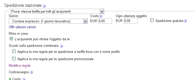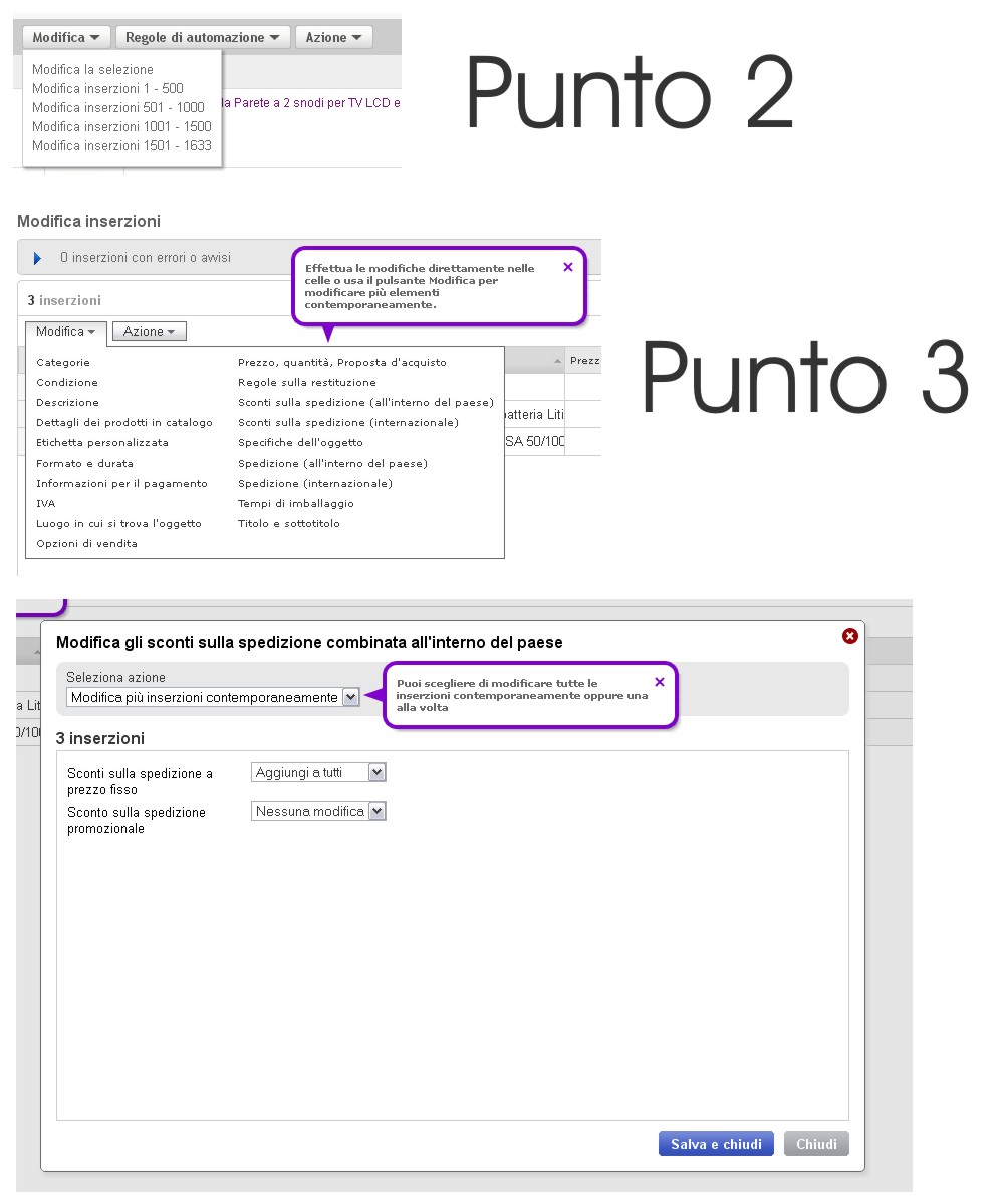 1. Apri oggetti in vendita in ebay 2. Clicchi su "Modifica" in alto a sinistra e selezioni il tipo di blocco (selezione oppure 500 per 500) 3. Selezioni "Sconti sulla Spedizione" Nazionale o estera 4. Applichi una o entrambe le opzioni a tutte le inserzioni del blocco