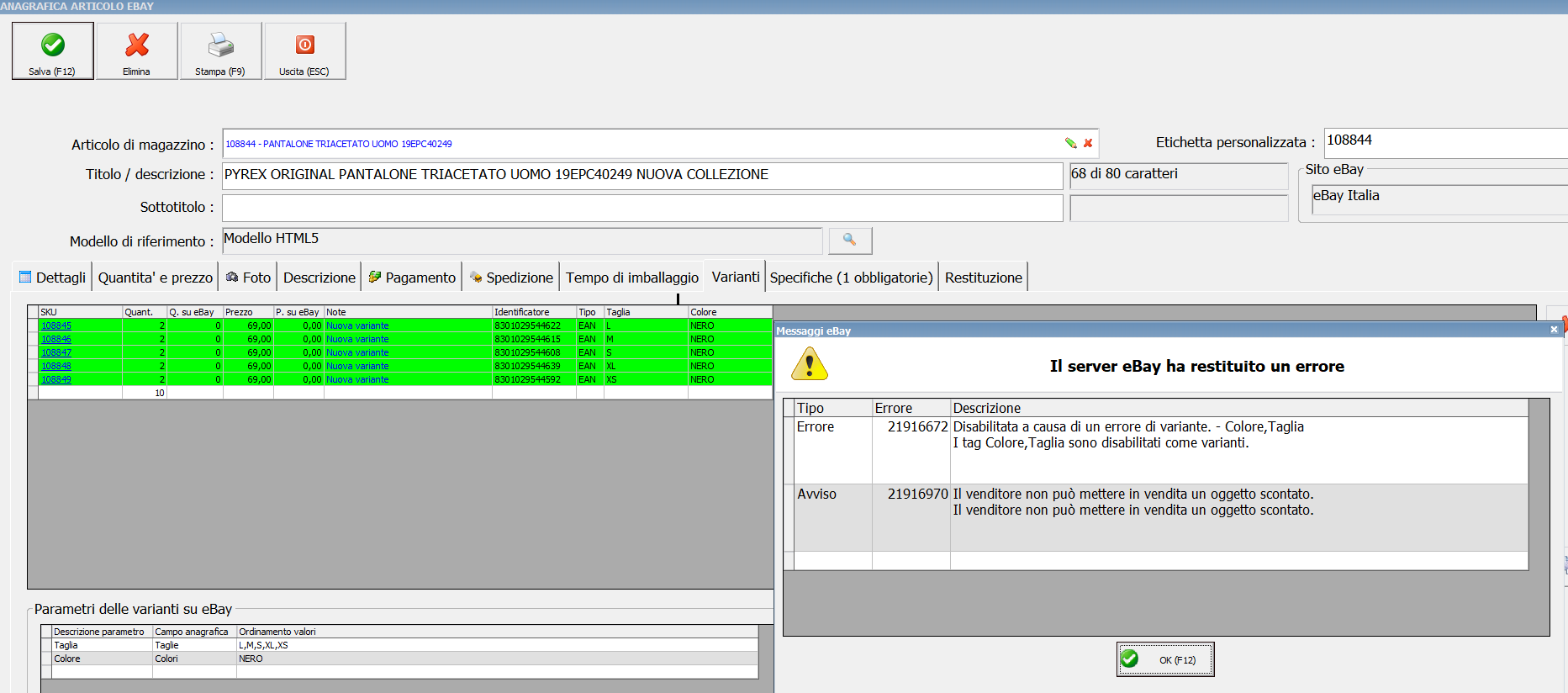 Il problema nello specifico e' che eBay non accetta più che vengano create inserzioni dove le varianti si chiamano "Taglia" o "Colore" (sui gruppi di venditori eBay ci sono tantissime segnalazioni per questo problema che e' presente da una decina di giorni, non è ovviamente un problema solo vostro)
