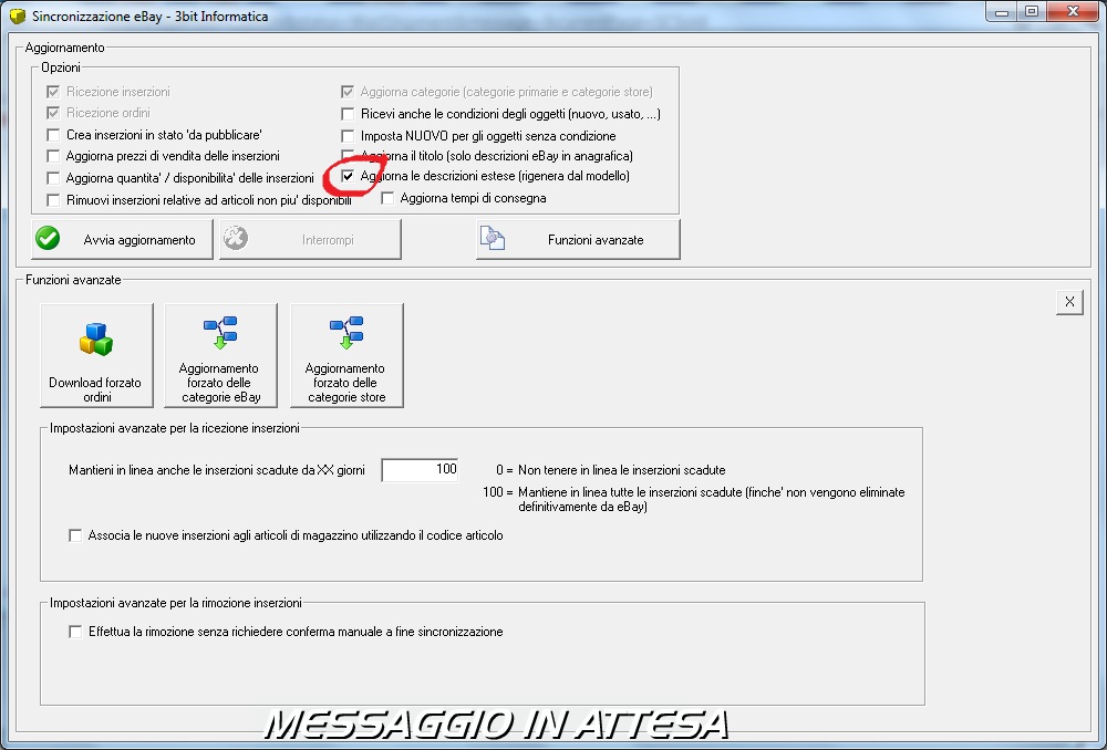Non esiste una opzione che consenta di aggiornare il modello solo per alcune inserzioni. E' presente una opzione all'interno della procedura di sincronizzazione ma rigenera la descrizione da modello per TUTTE le inserzioni attive.
