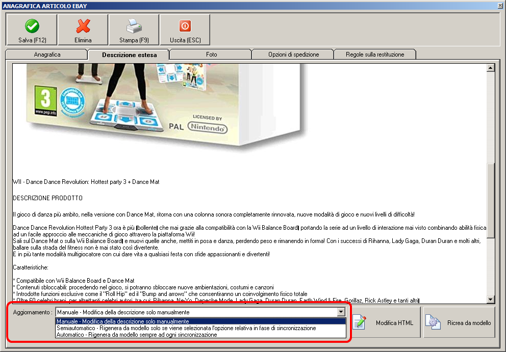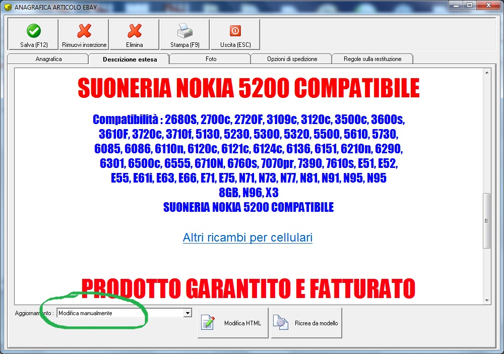 Anche io ho un grosso problema con la rigenerazione da modello. Utilizzo più modelli e a volte tramite il gateway Ebay->Descrizione estesa clicco su RIGENERA DA MODELLO per poter rigenerare la descrizione su un modello che non è di base per la categoria a cui appartiene l'articolo. Una custodia iPhone 4S, per esempio, è collegata al modello "Custodie", ma ho un altro modello "Offerte" dove specifico che se acquistano 2 custodie ne spedisco 3 e nello stesso tempo faccio lincare il prodotto ad altri accessori in promozione ecc...ecc.. . Quindi quando voglio fare promozioni mi apro il prodotto e lo rigeneroi sul modello che occorre. Fin qui, anche se è molto faticoso perché non è possibile selezionare più articoli contemporaneamente e collegarli ad un modello, va tutto bene. Il problema nasce quando apporto modifiche agli articoli in ReadyPro anche per l'ecommerce, dato che ho bisogno spesso di aggiornare la descrizione estesa (compatibilità degli accessori cellulari), perché a questo punto lancio nel gateway Ebay Aggiorna le descrizioni estese (rigenera da modello) e noto che anche se i prodotti sono settati su Aggionamento->modifica manualmente, i prodotti vengono modificati in base al modlelo iniziale perdendo così tutto il lavoro delle promozioni e quindi ho anche problemi collegati a prezzi studiati per tali promozioni, link con altri prodotti in promozioni su Ebay ecc... Ci sono altri casi simili in cui ho bisogno di rigenerare su altri modelli, quindi così facendo non riesco più a gestire il lavoro e a ripristinare tutte quelle inserzioni che erano su modelli diversi. Allego screenshot sperando che si tratti di un mio errore ed avere qualche spiegazione in merito.