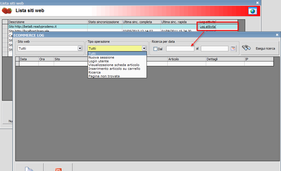 Modulo: Ecommerce -Log delle attivita' (solo per versioni Ready Pro basate su MS SQL SERVER)