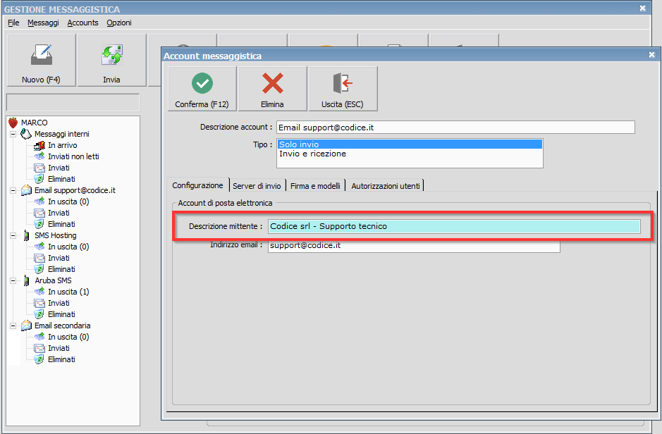 Procedura : Gestione messaggistica - Nuovo campo che consente di personalizzare il mittente delle email (in precedenza veniva utilizzata la descrizione principale dell'account)