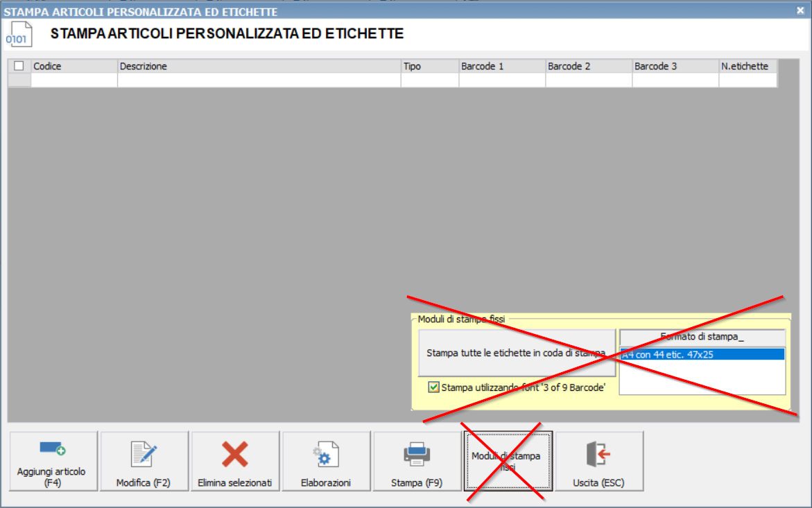 Procedura: Stampa articoli/codici a barre - Rimossi i vecchi moduli di stampa fissi non personalizzabili