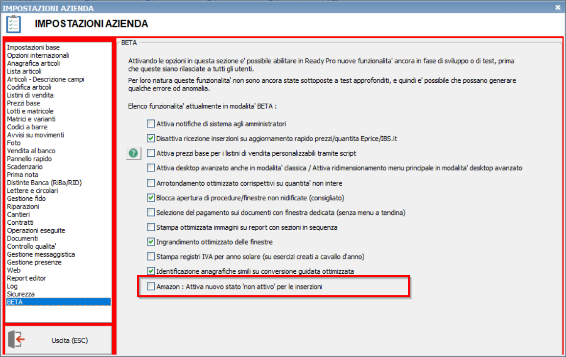 Procedura: Gestione inserzioni Amazon - Disponibile un nuovo stato "non attivo" per le inserzioni Amazon (per il momento solo come funzionalità BETA attivabile tramite apposita opzione su IMPOSTAZIONI AZIENDA)