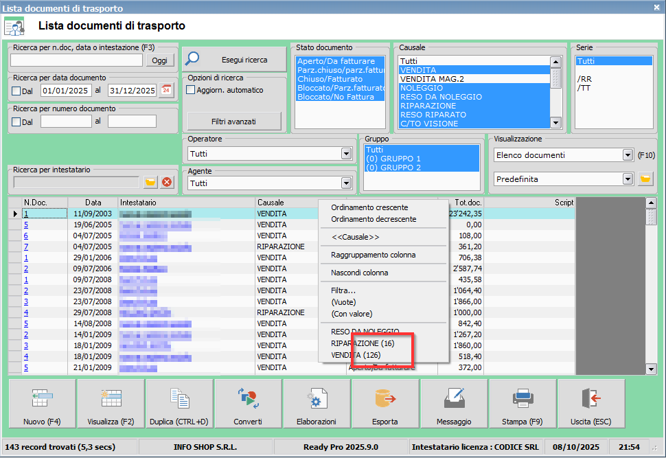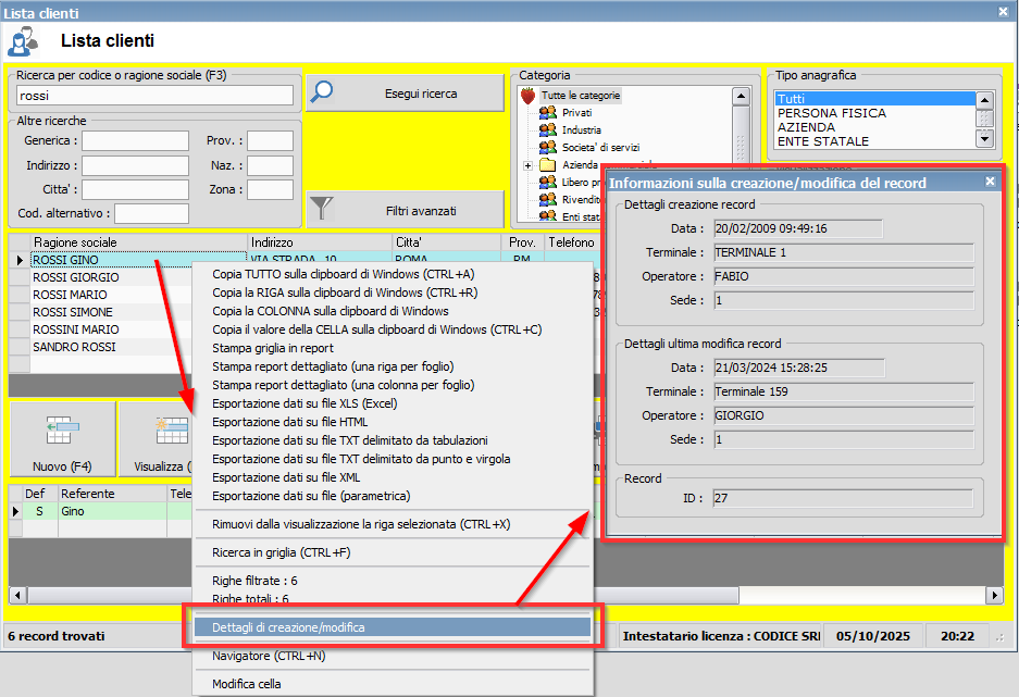 Sugli elenchi delle principali procedure (anagrafiche, documenti) nel menu contestuale e' stata aggiunta una opzione "Dettagli di creazione/modifica" che consente di accedere rapidamente alle informazioni di creazione/ultima modifica dei record