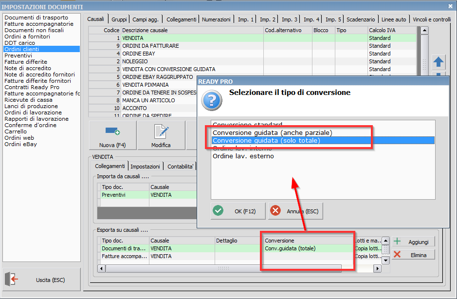 Procedura: Conversione guidata documenti - Sul collegamento tra causali e' possibile ora scegliere anche di obbligare gli operatori ad una conversione guidata "totale" ovvero dove e' possibile confermare la conversione guidata solo in caso di conversione di tutte le linee previste sul documento di origine. Il comportamento che fino ad oggi era previsto corrisponde invece all'opzione "Conversione guidata (anche parziale)" ovvero in fase di conversione l'operatore puo' decidere di convertire sul documento di destinazione anche solo una parte degli articoli