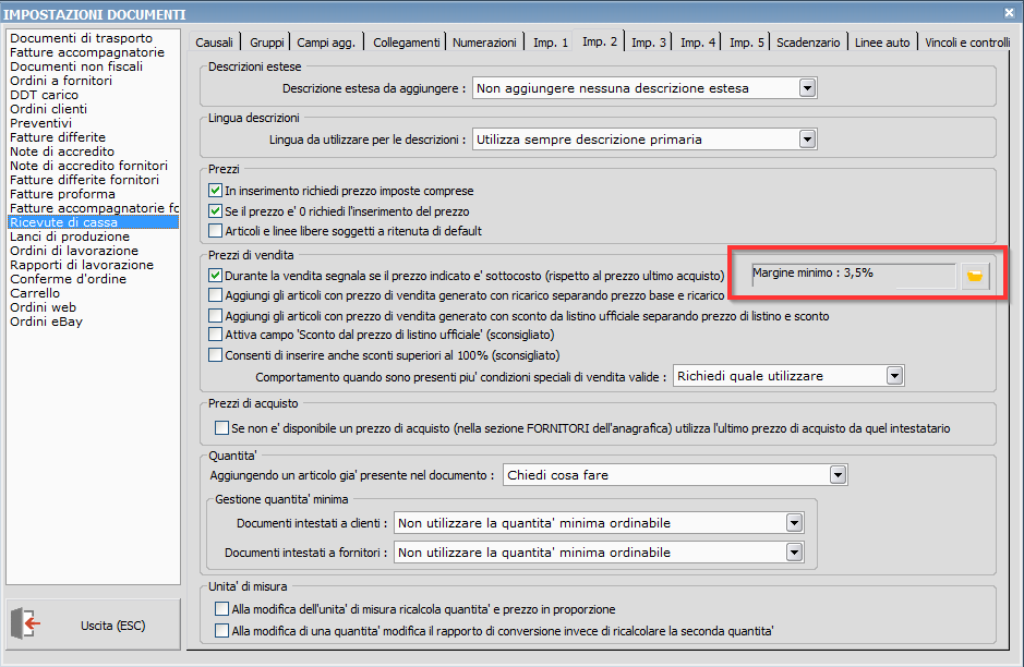 Procedura: Documenti di magazzino - Possibilità di personalizzare il margine minimo sotto il quale mostrare un avviso di vendita sottocosto