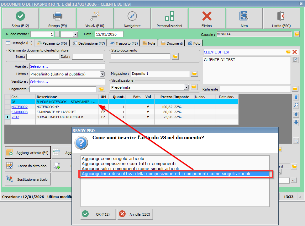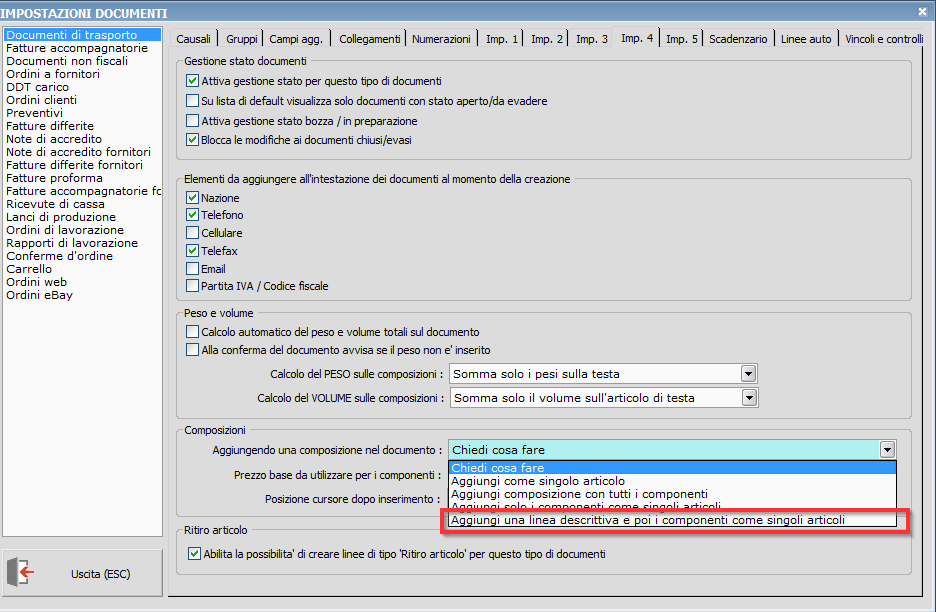 Procedura: Composizioni - Sui documenti e' possibile aggiungere le composizioni esplose con i singoli articoli, anche aggiungendo una linea descrittiva di testata (con codice e descrizione della composizione)