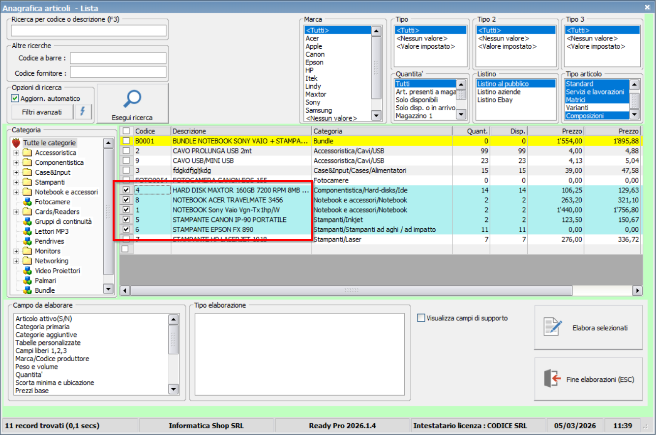 Griglie di elaborazione su Ready Pro - Sulle griglie con l'opzione di spunta/checkbox sulla colonna di sinistra è pra possibile selezionare piu' righe, come da standard Windows, facendo click sulla riga finale di selezione e tenendo premuto il tasto SHIFT sulla tastiera