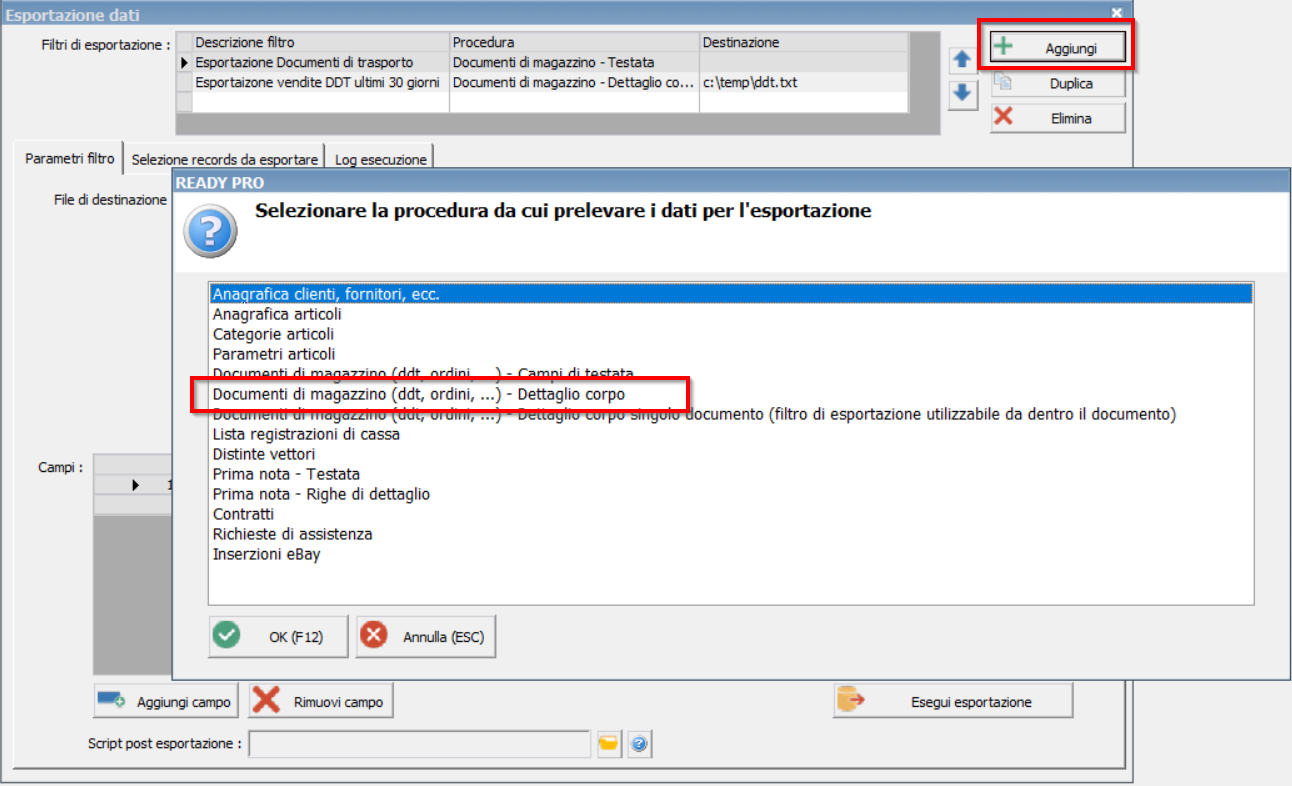 Procedura : Esportazione dati - Nuovi filtri di esportazione per corpo dei documenti