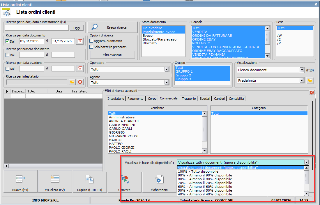 Procedura : Ordini clienti - E' stato sostituito lo slider che consentiva la ricerca degli articoli in base alla disponibilita' con un menu a tendina standard