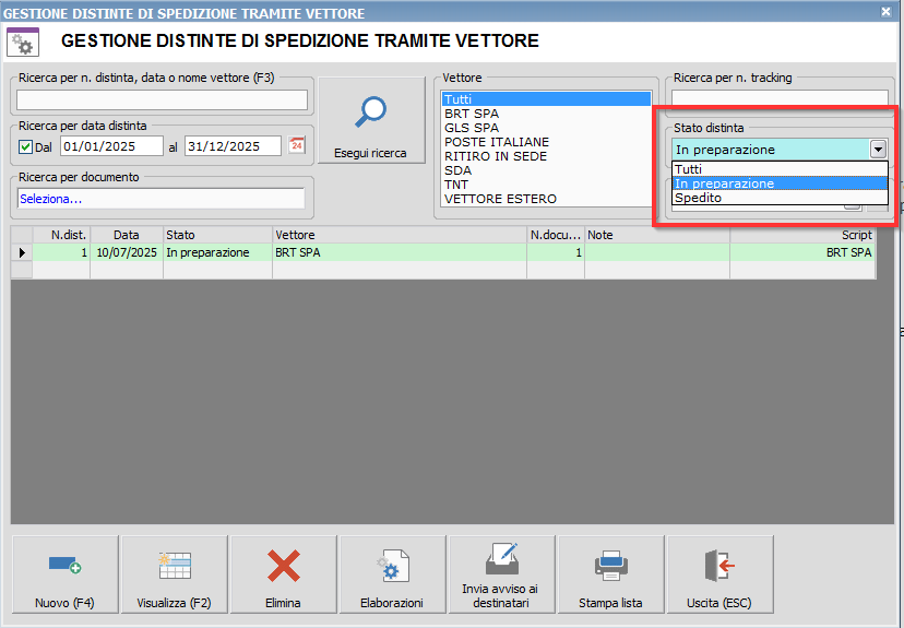 Procedura: Distinte vettori -Filtro per stato distinta