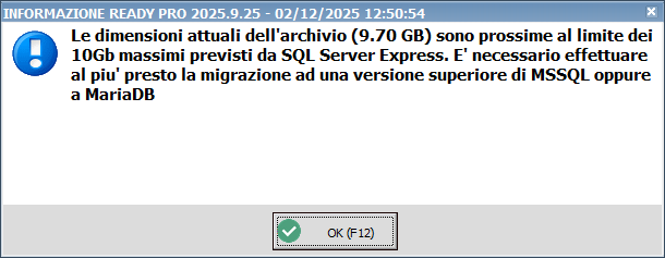 Modulo: SQL - Per chi utilizza database Microsoft SQL Server in versione EXPRESS viene visualizzato un messaggio se la dimensione del database e' oltre i 9Gb, e quindi si avvicina ai 10Gb massimi consentiti da MSSQL Express