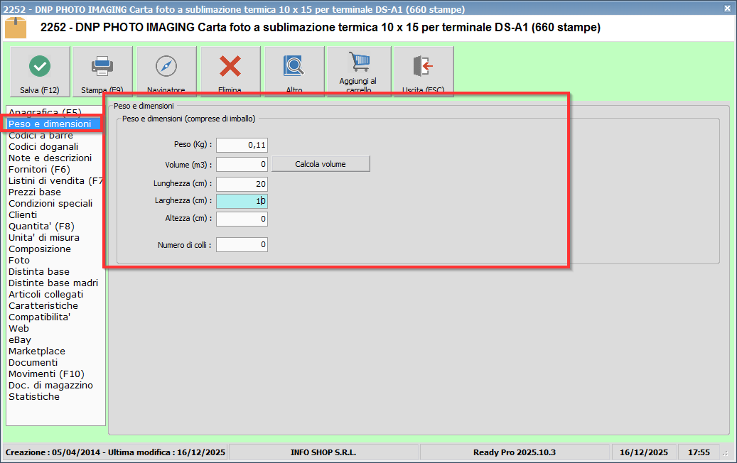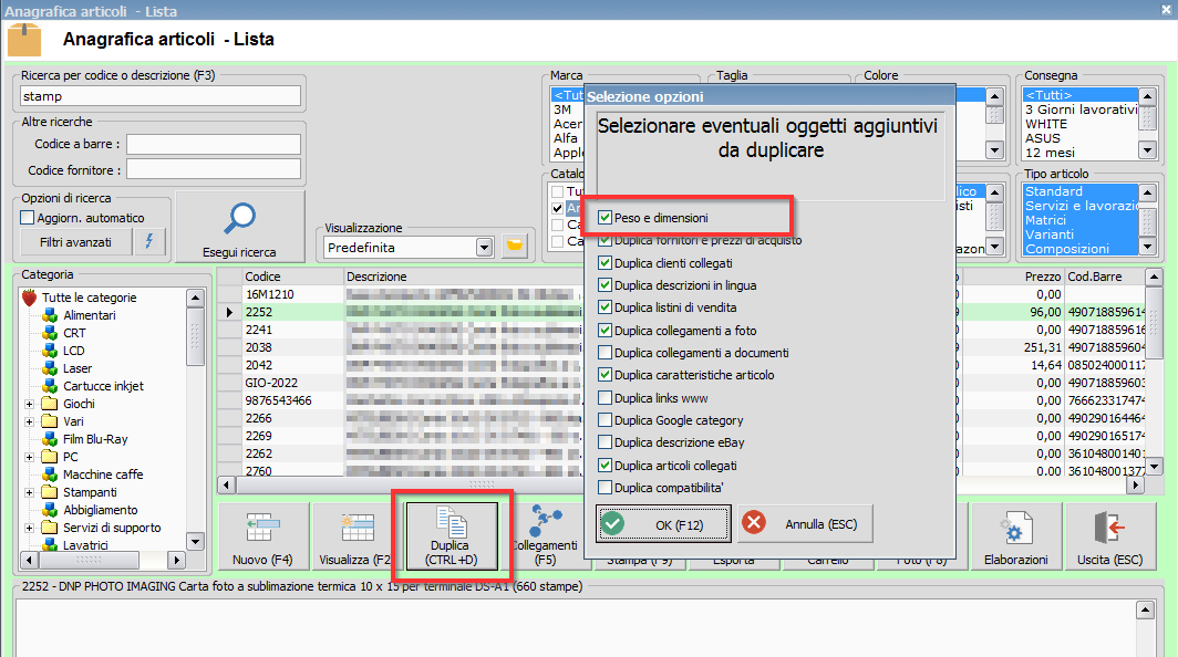 Procedura: Anagrafica articoli - Su duplicazione anagrafica articoli è ora disponibile una opzione specifica per decidere se duplicare anche i campi della sezione "Peso e dimensioni"