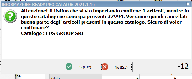"ATTENZIONE: Il listino che si sta importando contiene 1 articoli, mentre in questo catalogo ne sono già presenti 37994. Verranno cancellati buona parte degli articoli"