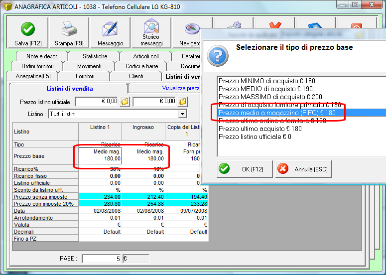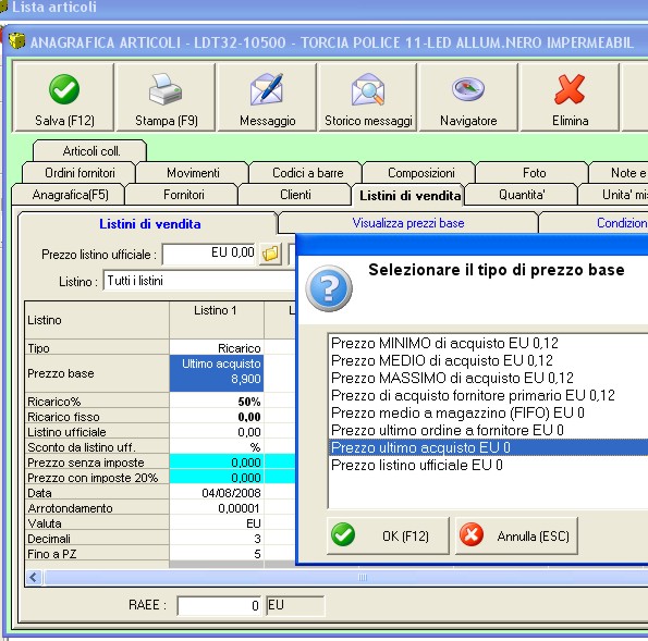 Ti Allego uno screenshot, x agg. listino all'ultimo prezzo. puoi anche dirmi perchè nel selezzionare il tipo di prezzo, per alcuni mi vostra il valore = a "zero"?