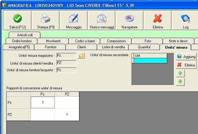 Citazione: Per l'unità di conversione da eliminare non ti preoccupare ho risolto. Ok, anche se ho visto che c'e' tutto uno storico di documenti creato con N, PZ, PZ. che sarebbe bene allineare tutti alla stessa unita' di misura (ma possiamo farlo solo noi intervenendo direttamente sul DB, ed e' un lavoro che puo' richiedere anche qualche ora)