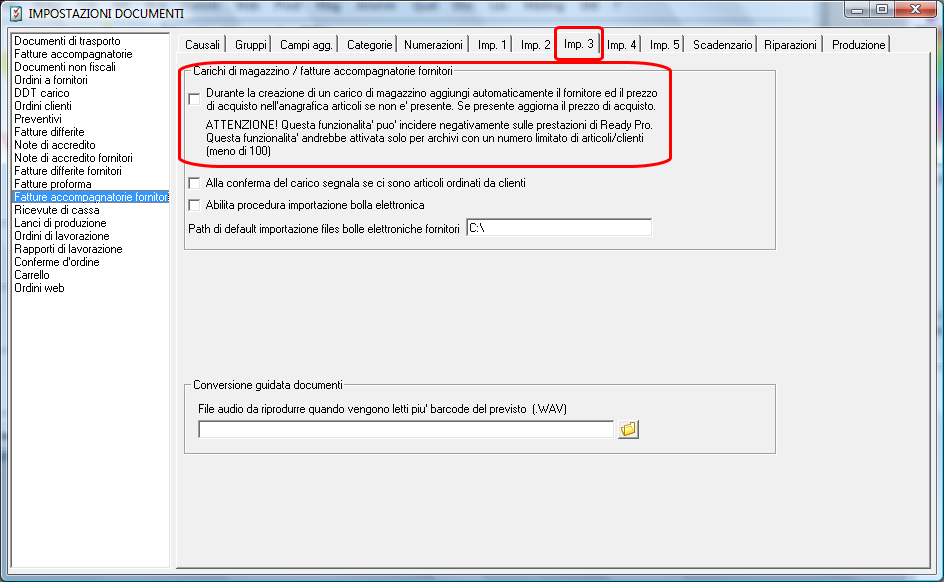 Se in fase di carico vuoi aggiornare automaticamente il fornitore e il prezzo di acquisto puoi attivare l'opzione indicata nello screenshot su UTIL / IMPOSTAZIONI DOCUMENTI: