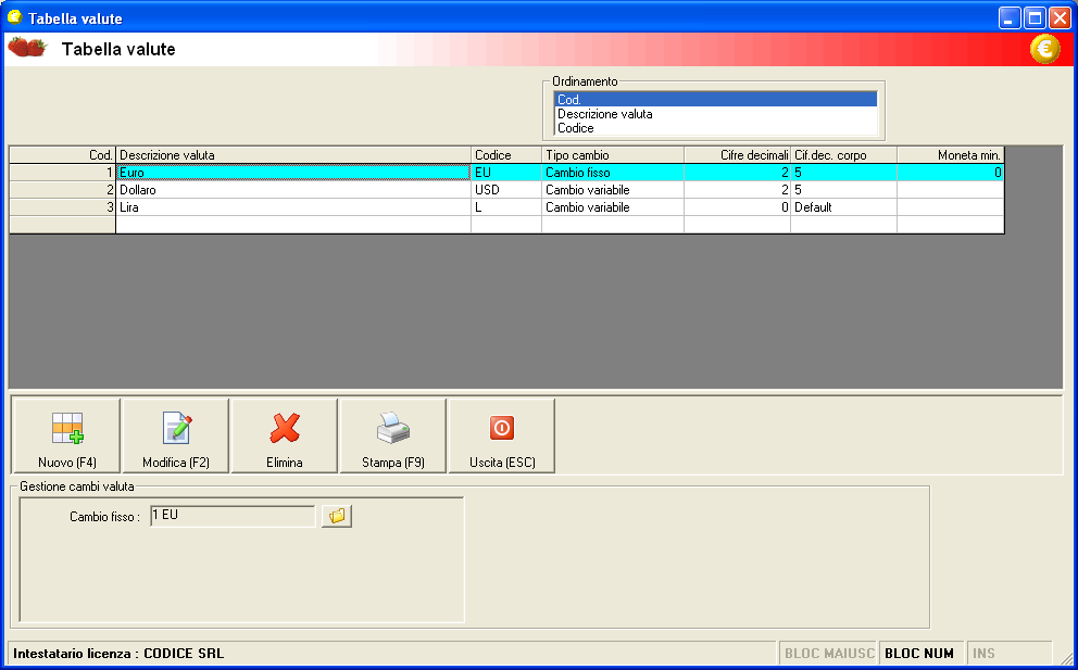 Poi vedo che nella tabella delle valute hai creato il Dollaro USA e la Lira (ma a cosa ti serve la Lira?) Non mi pare che sull'archivio tu li stia utilizzando. Se effettivamente non ti servono io ti consiglio di eliminarli perche' rischi di fare solo confusione