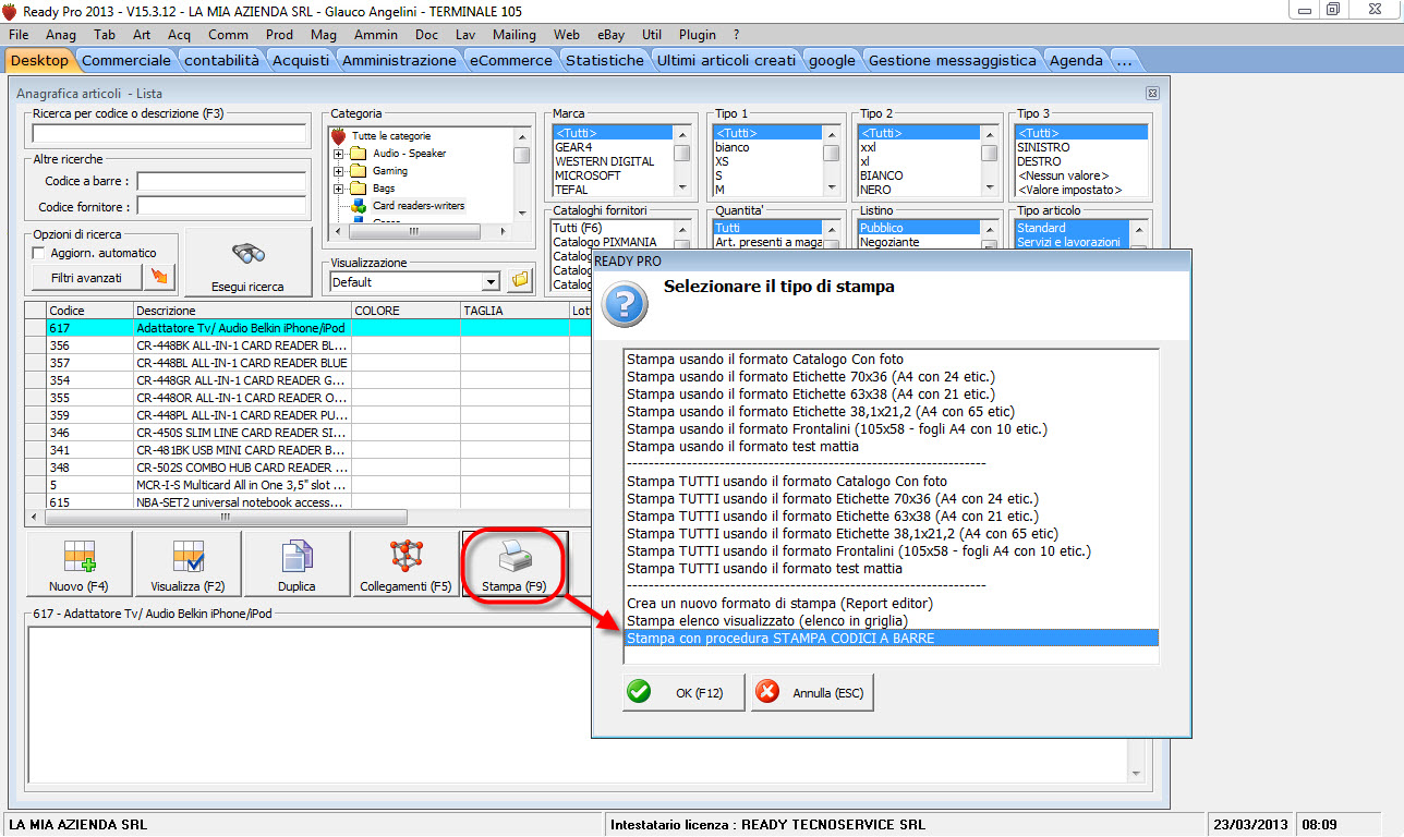 STAMPA ART PERS./ STAMP. ETICHET. CODICI A BARRE seleziono nella ricerca le varianti e a quel punto flaggo tutto. Seleziono" stampa in base alle giacenze di magazzino. Il risultato è quello che ho scritto. Chiaramente è risolvibile eliminando il flag sull'articolo matrice. Il problema e quando ristampi un magazzino di 20 articoli con tre colore e 4 taglie; devi entrare e deselezionare le matrici.