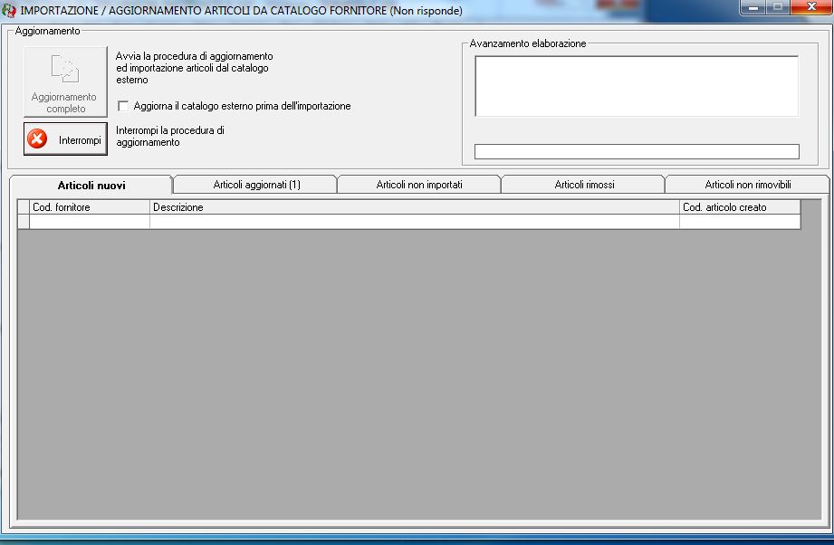 Appena lancio l'aggiornamento /importazione catalogo fornitori l'elaborazione rimane su aggiornamento e passa dopo un pò che è fermo a non risponde, ho provato a reinstalllare ready e fare tutti gli aggiornamenti ma nulla e è da premettere che questa anomalia la fà con tutti i cataloghi presenti. Rimane con la paggina di aggiornamento catalogo bloccata poi si riprende dopo tantissimo e poi di nuovo si riblocca, il catologo esterno lo aggiorna ma il problema rimane sull'importazione/aggiornamento del catalogo...