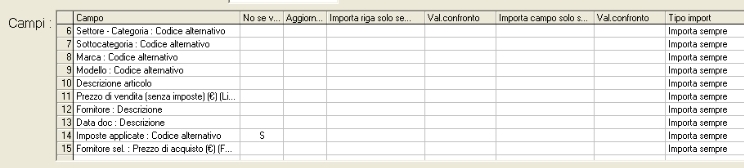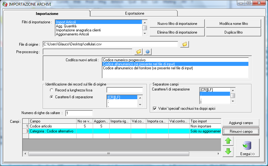 Grazie Glauco, non avevo colto che le differenze dei codici alternativi dovevano tener conto anche delle macrocategorie. Quindi ho reimportato le sole categorie mancanti dando un CODICE ALTERNATIVO differente nel caso fossero già presenti in altre macrocategorie. Poi ho provato ad aggiornare l'anagrafica articoli per i soli campi 6 e 14 del filtro importazione creato (vedi allegato) con diverse impostazioni del "Tipo di import", ma invece di aggiornare mi ritrovo il raddoppio degli articoli in anagrafica. Che tipo di impostazione dovrei impostare nel filtro per il solo aggiornamento di due campi specifici?