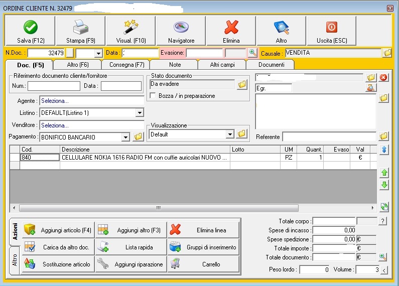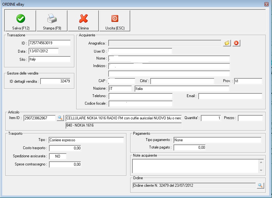 "nokia 1616" è il riferimento all'articolo creato nella tua lista articoli, ma non è quello che ha visto e confermato il cliente su ebay. L'interno dell'ordine cliente (che non vediamo negli screenshot) quale dicitura contiene?